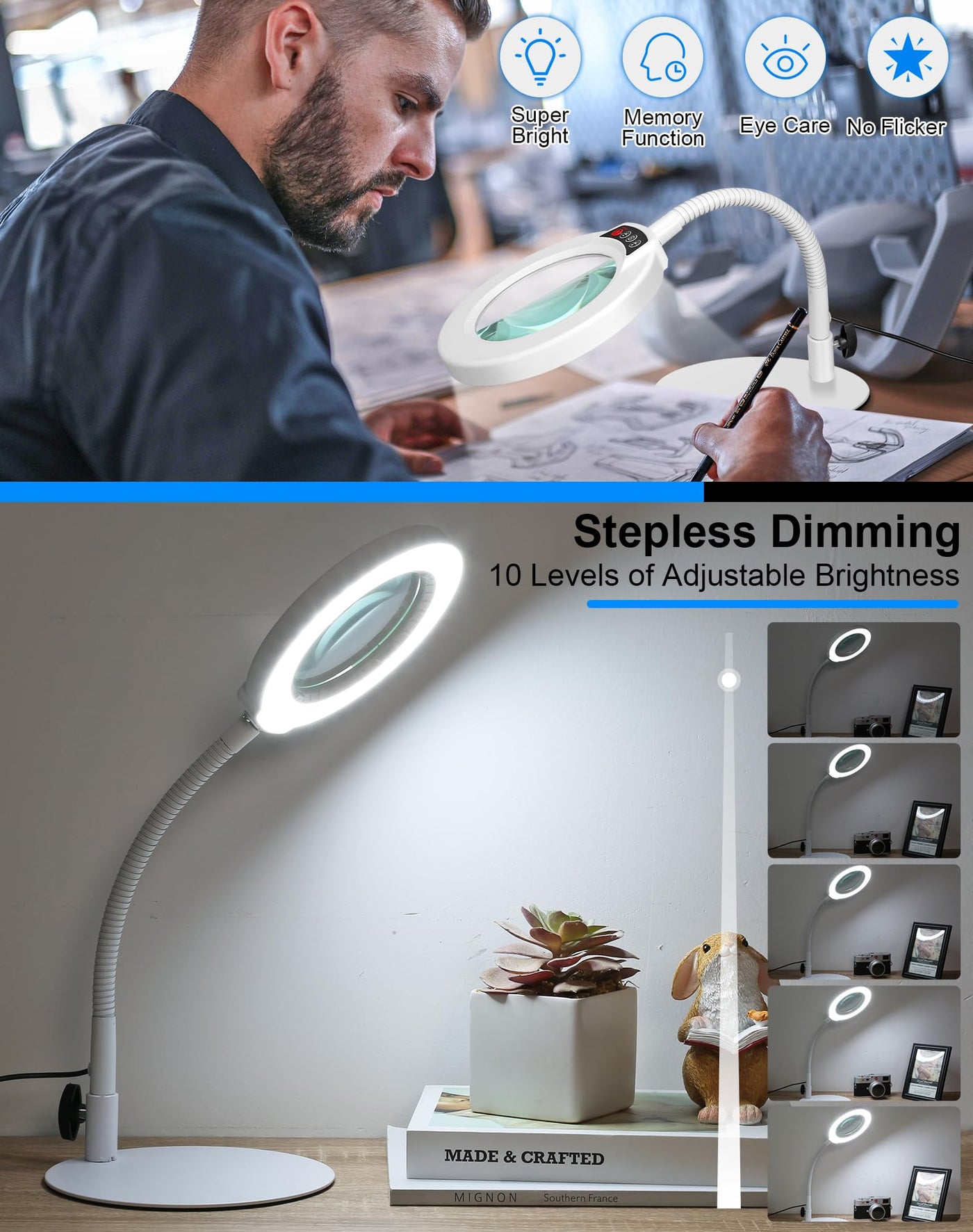 Q: How does the lighting feature work on this magnifying lamp?A: This magnifying lamp features 5 adjustable color modes and 10 dimmable brightness levels, ensuring optimal lighting for various tasks without causing eye strain.
