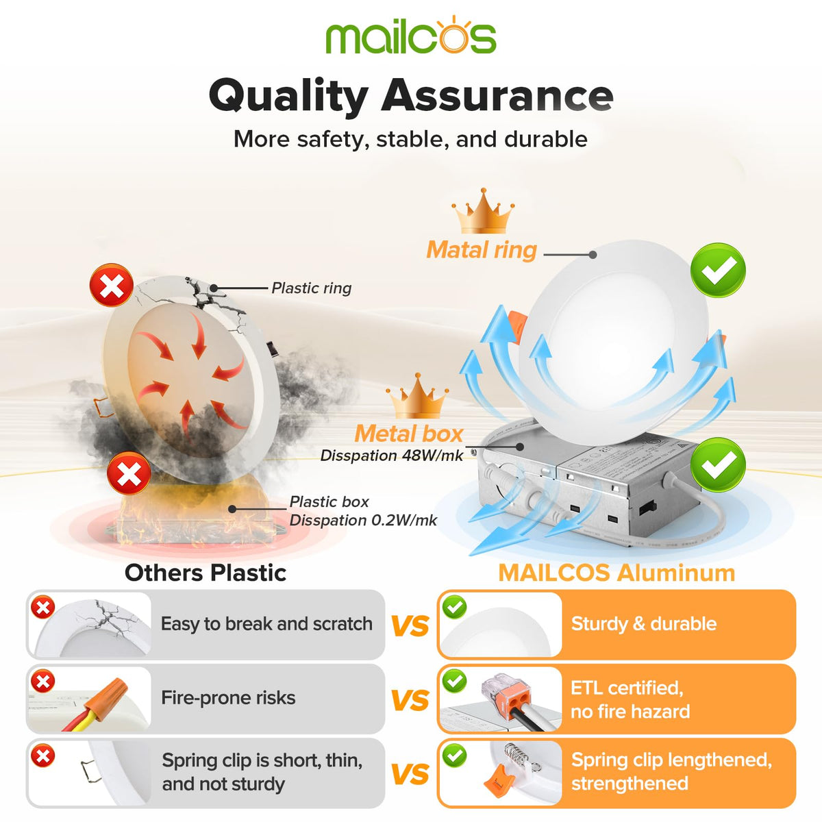 Q: What materials are used in the construction of the MAILCOS recessed lights?A: The MAILCOS recessed lights are made entirely of metal materials with a wear-resistant white paint finish, ensuring higher quality and safety compared to those made of plastic. This construction contributes to the durability and longevity of the lights, which have a lifespan of up to 50,000 hours.