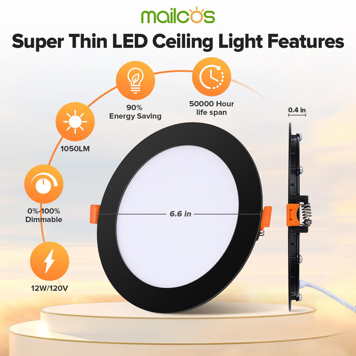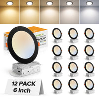 Mailcos 12 Pack 6 Inch 5Cct Black Ultra-Thin Led Recessed Lighting With Junction Box, 2700K-5000K Selectable, 1050Lm High Bright