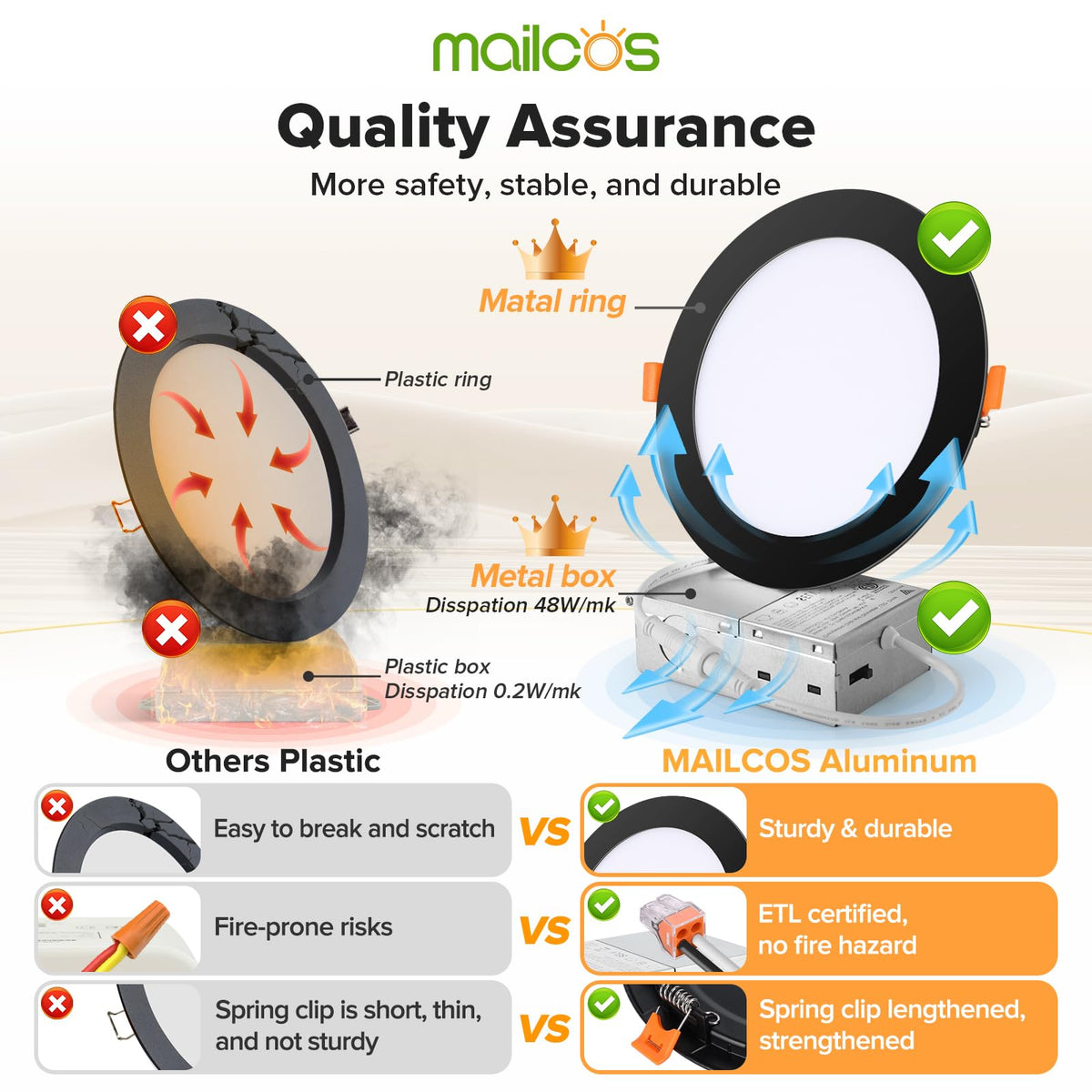Q: Is the Mailcos recessed lighting safe for use in insulated ceilings?A: Yes, the Mailcos recessed lighting is IC rated, which means it is safe to use in contact with insulation in ceilings. The junction box is thermally protected, minimizing any fire hazard risks during installation.