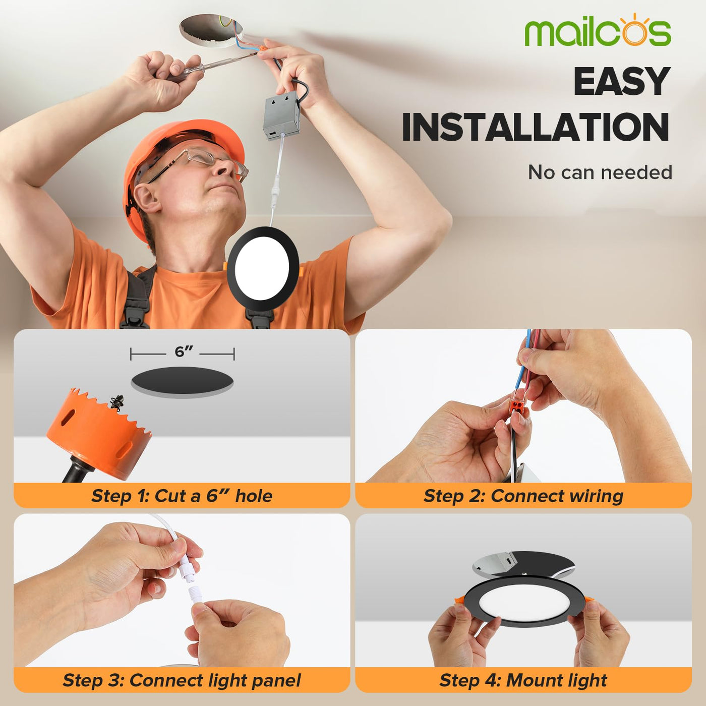 Q: How do I install the Mailcos canless recessed lighting?A: Installing the Mailcos canless recessed lighting is straightforward. You need to cut a hole in the ceiling using the provided 1:1 hole template, connect the junction box to the cable, and then use the spring clip to securely fix the light in place. It only requires about 2 inches of ceiling space.