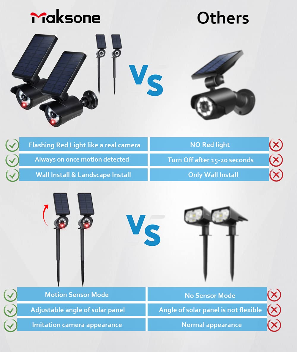 Q: How do these lights compare to traditional security cameras?A: Unlike traditional security cameras, which can be costly, the Maksone solar lights are an affordable alternative that also provide security benefits. They are a fraction of the cost, require no wiring, and can effectively deter intruders without the need for complex installation or monitoring.