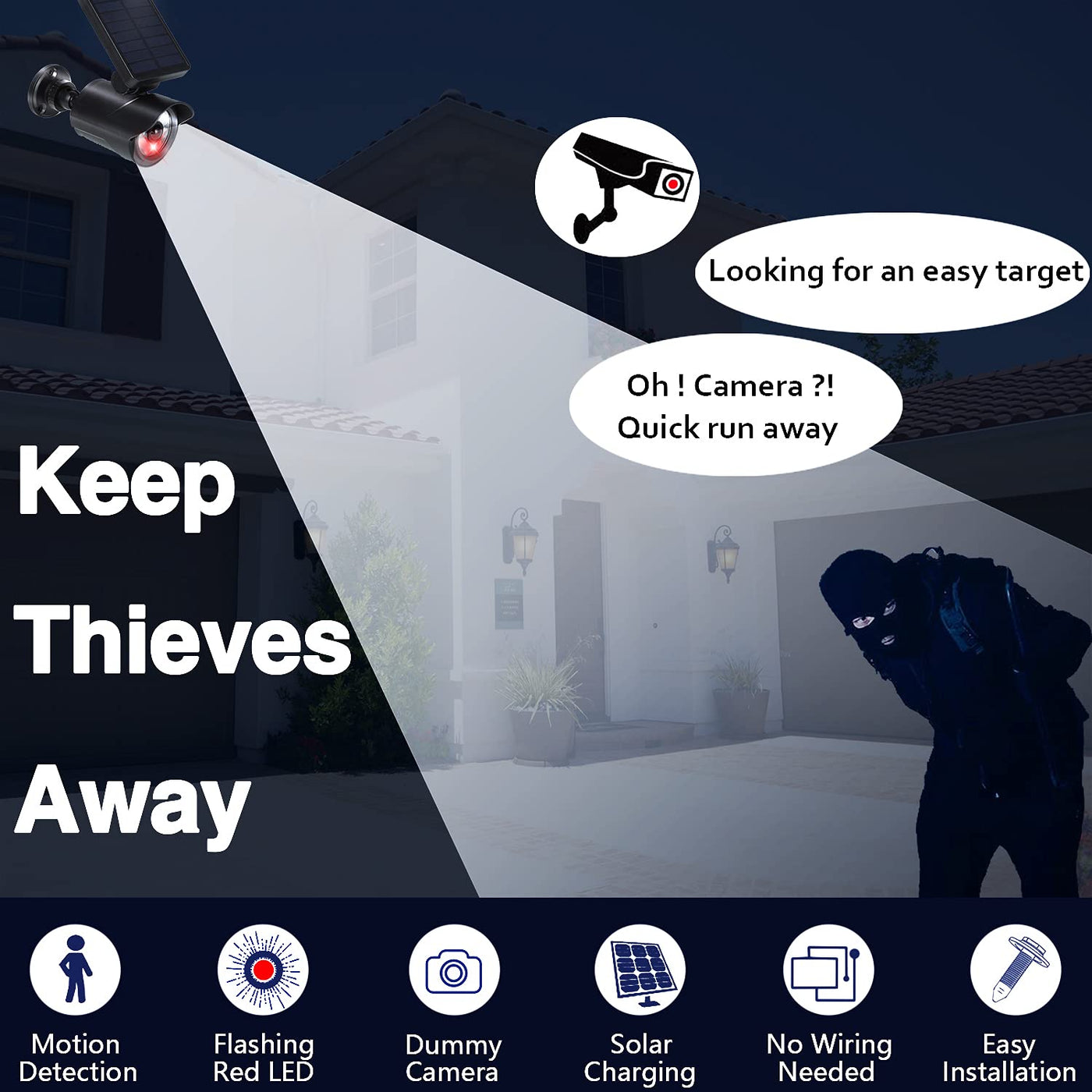 - **Energy Saving**: Designed for efficiency, the solar lights come with a built-in photocell sensor that turns off automatically during the day and activates at night upon detecting motion. When there is no movement, the red LED remains on as a dummy camera, effectively misleading burglars.