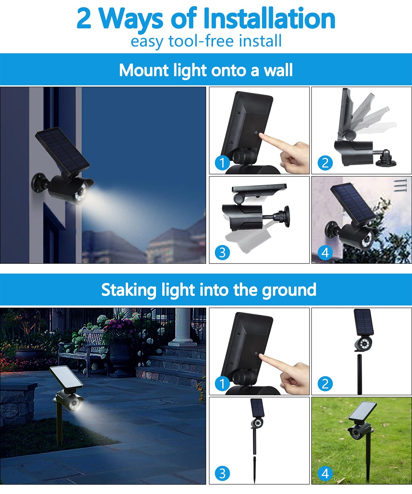 - **2 in 1 Portable and Easy to Install**: Versatile in function, it can be utilized as both a landscape light and a wall light. The solar motion sensor light features a holder that rotates 360°, while the adjustable solar panel allows for optimal lighting angles.