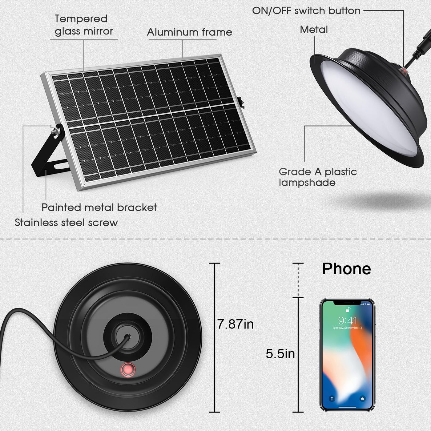 Product Specification: ?Solar Panel: 6V/6W poly-crystalline silicon (aluminum). ?Lighting Time: a.100% brightness: 6-8hrs b.50% brightness: 12-14hrs ?Light Source: 1000 Lumen (500lumen*2) (100% brightness), 120pcs LED (2835SMD): 60pcs for cool white, 60pcs for warm white ?Lamp material: Aluminum+Grade A plastic ?Waterproof Rate: IP65 Application: Outdoor/Indoor: Shed, Barn, Porch, Yard, Patio, Garden, Garage, Hallway, Home etc.