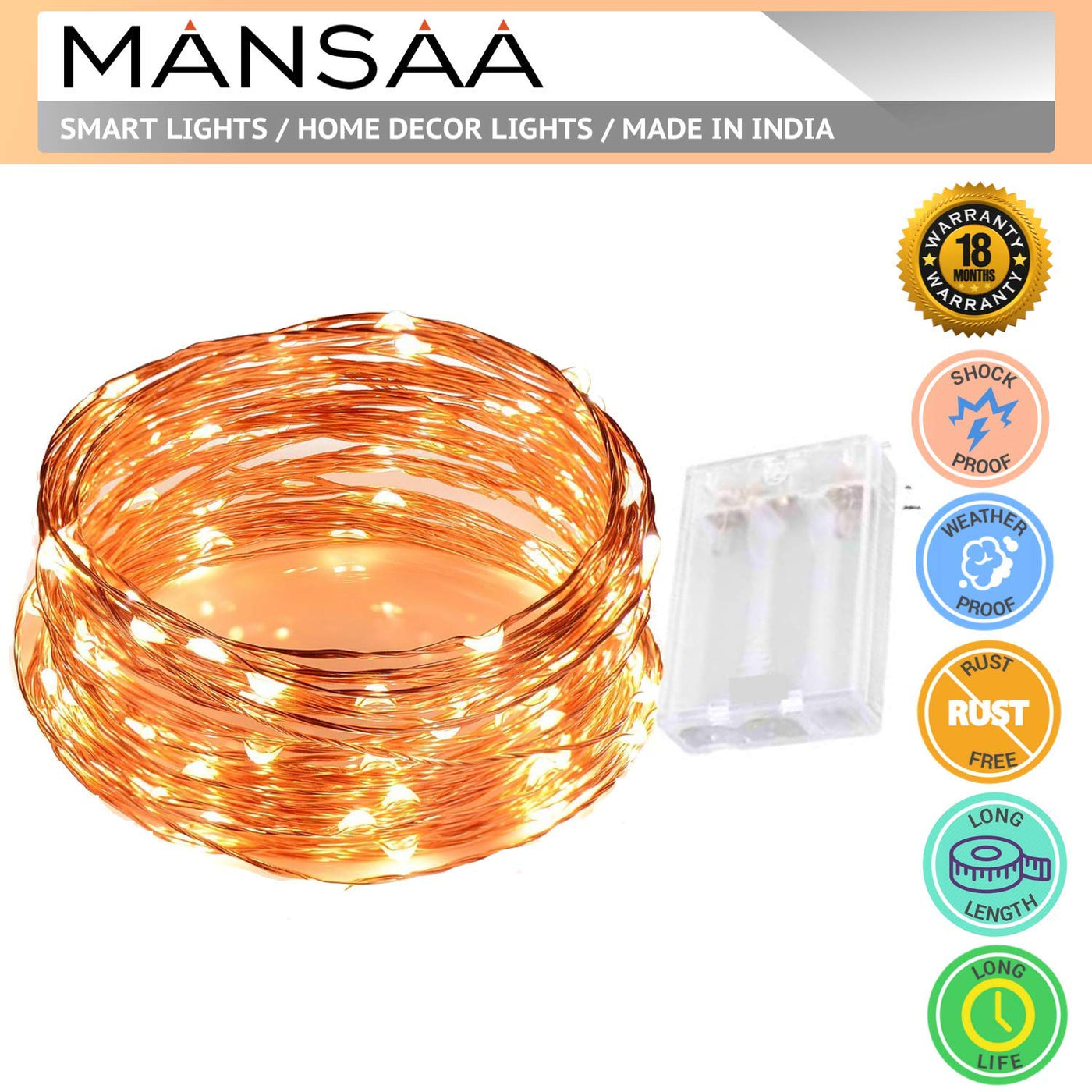 MANSAA M25 Battery Operated LED String Light | 5 Meter 50 LEDs | Yellow Color | Battery Led Lights | Home Decor