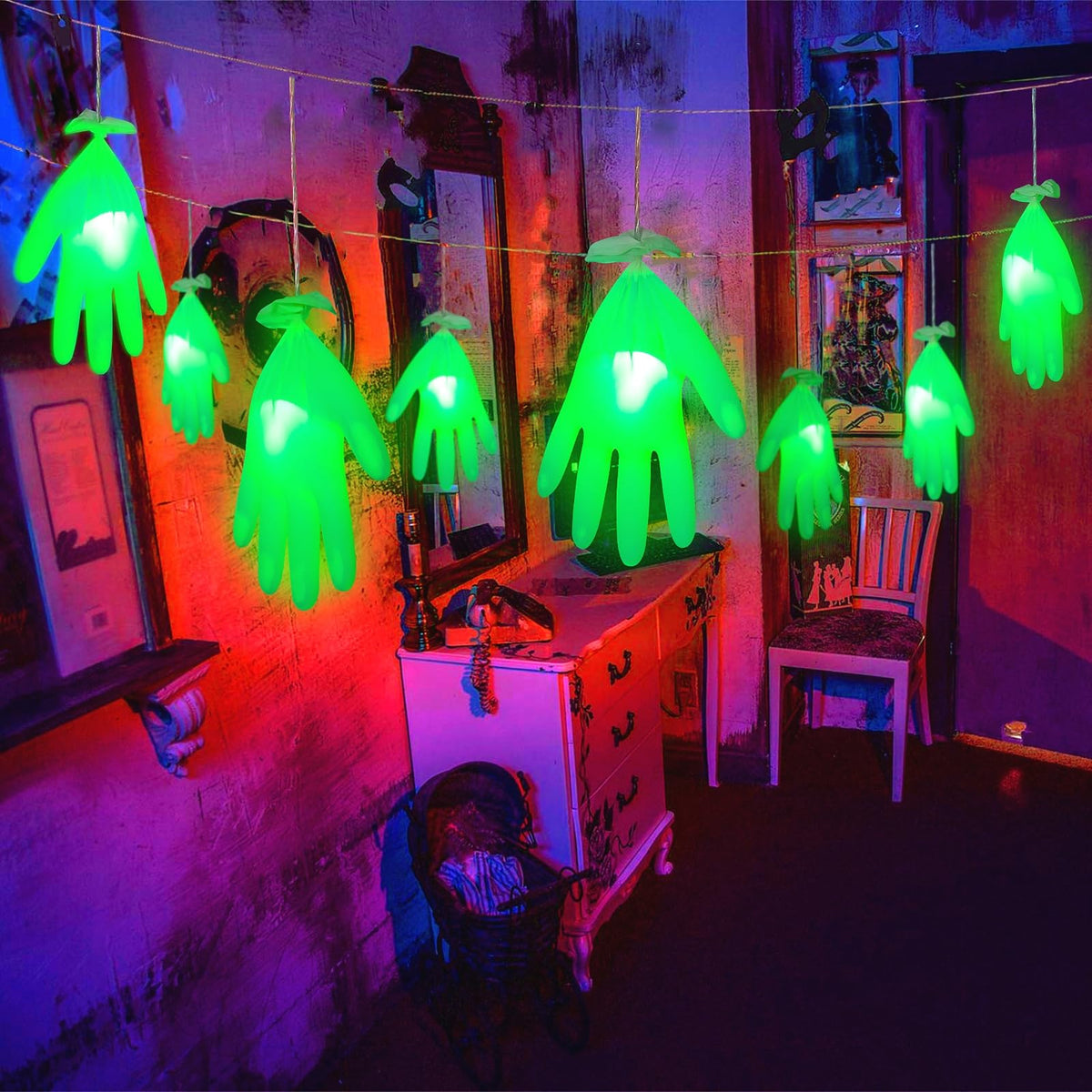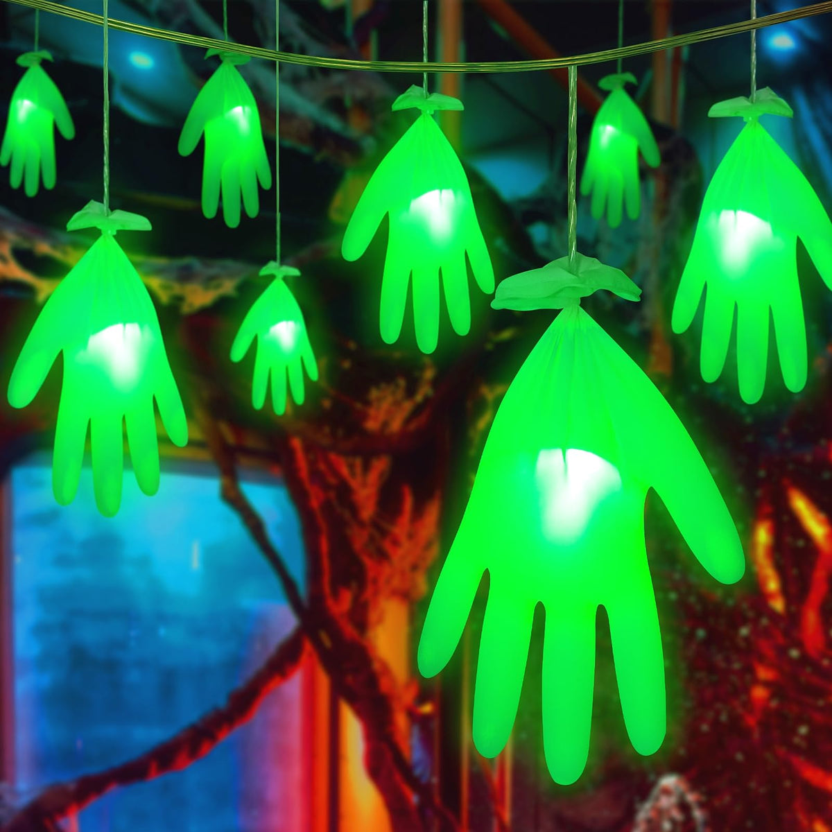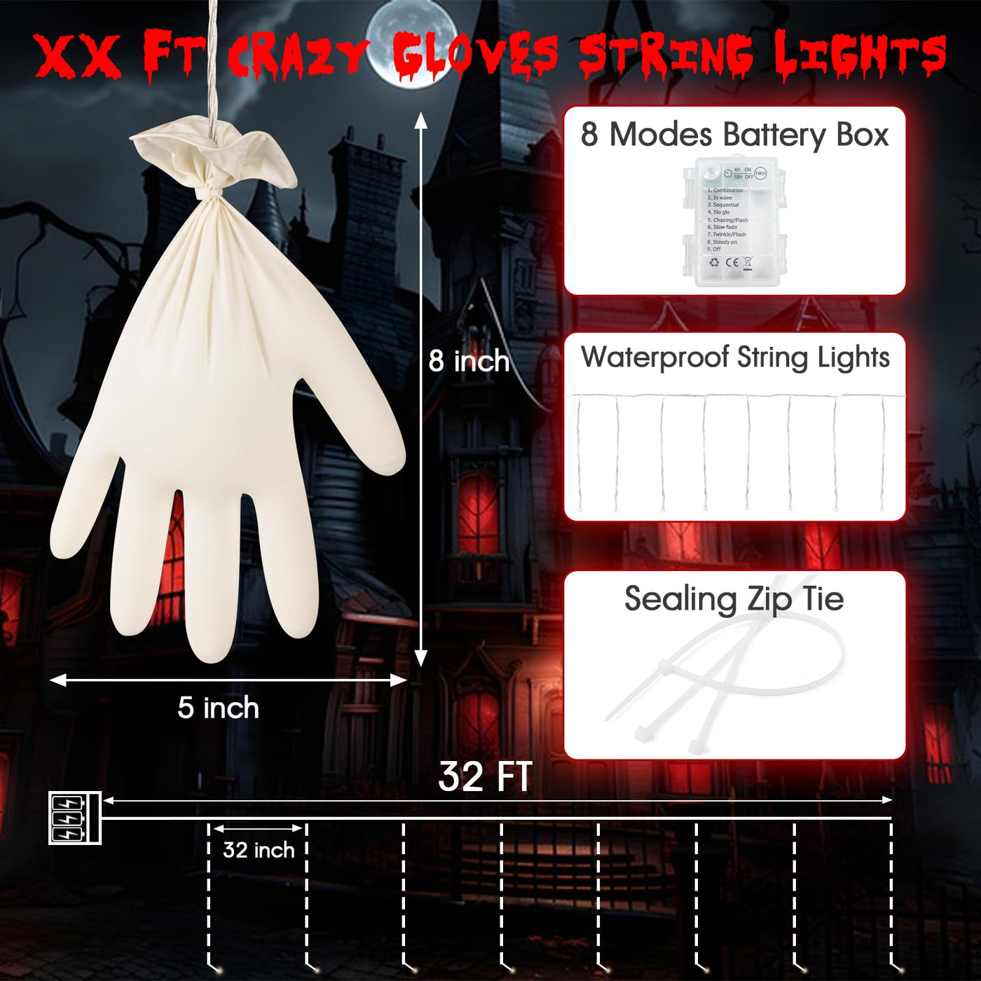 The MAOYUE Halloween lights feature a unique design in the shape of hands, measuring 32 feet in total length, adorned with 8 LED lights. These lights are equipped with dimmer controls, allowing you to customize the brightness to suit your Halloween theme. The combination of various lighting modes makes the lights versatile and visually appealing, providing the perfect ambiance for Halloween-themed parties or gatherings.