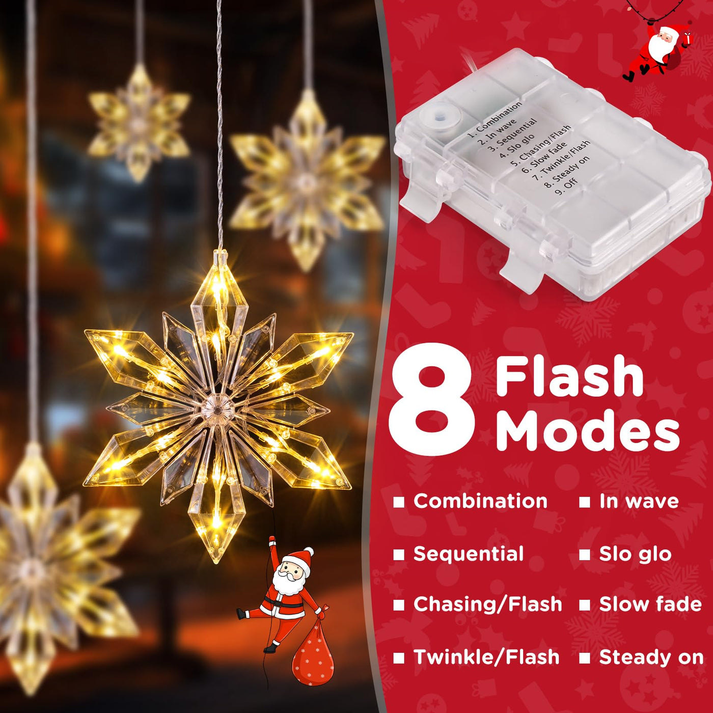 Q: What are the lighting modes available for the Marchpower Christmas Snowflake Window Lights?A: The Marchpower Christmas Snowflake Window Lights feature 8 different lighting modes, including combination, in wave, sequential, slow glow, chasing flash, slow fade, twinkle flash, and steady on. This variety allows you to create the perfect ambiance for any occasion.