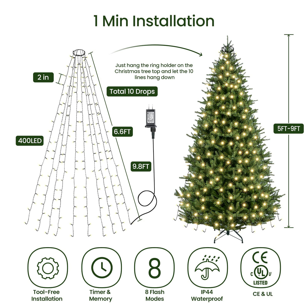 Marchpower Christmas Tree Lights 6.6Ft X 10 Lines, 400 Ultra-Bright Diamond Led Beads, 1 Min Installation Christmas String Lights With 8 Modes Timer & Memory Function, Ip44 Waterproof Warm White