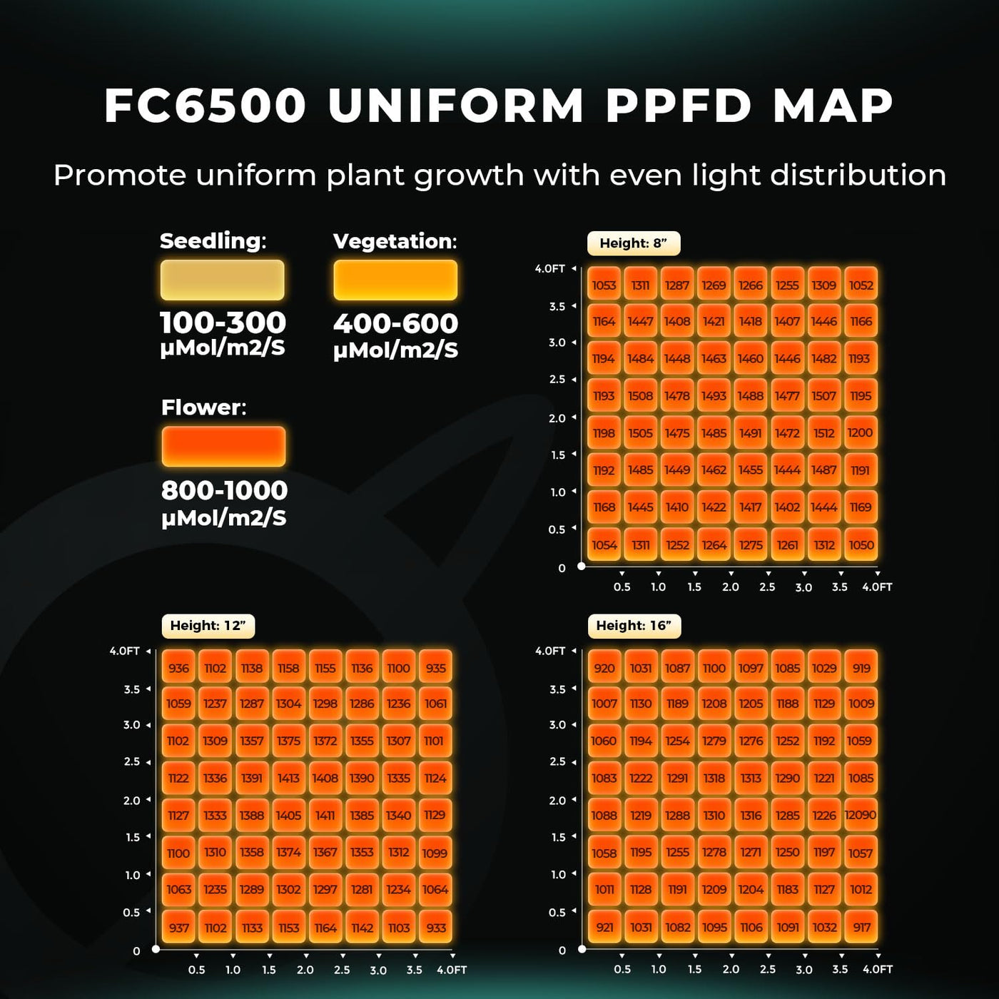 Q: What is the recommended grow tent size for the MARS HYDRO FC6500?A: The MARS HYDRO FC6500 is ideal for a 5x5 ft grow tent, providing ample light coverage for both vegetative and flowering stages of plant growth.