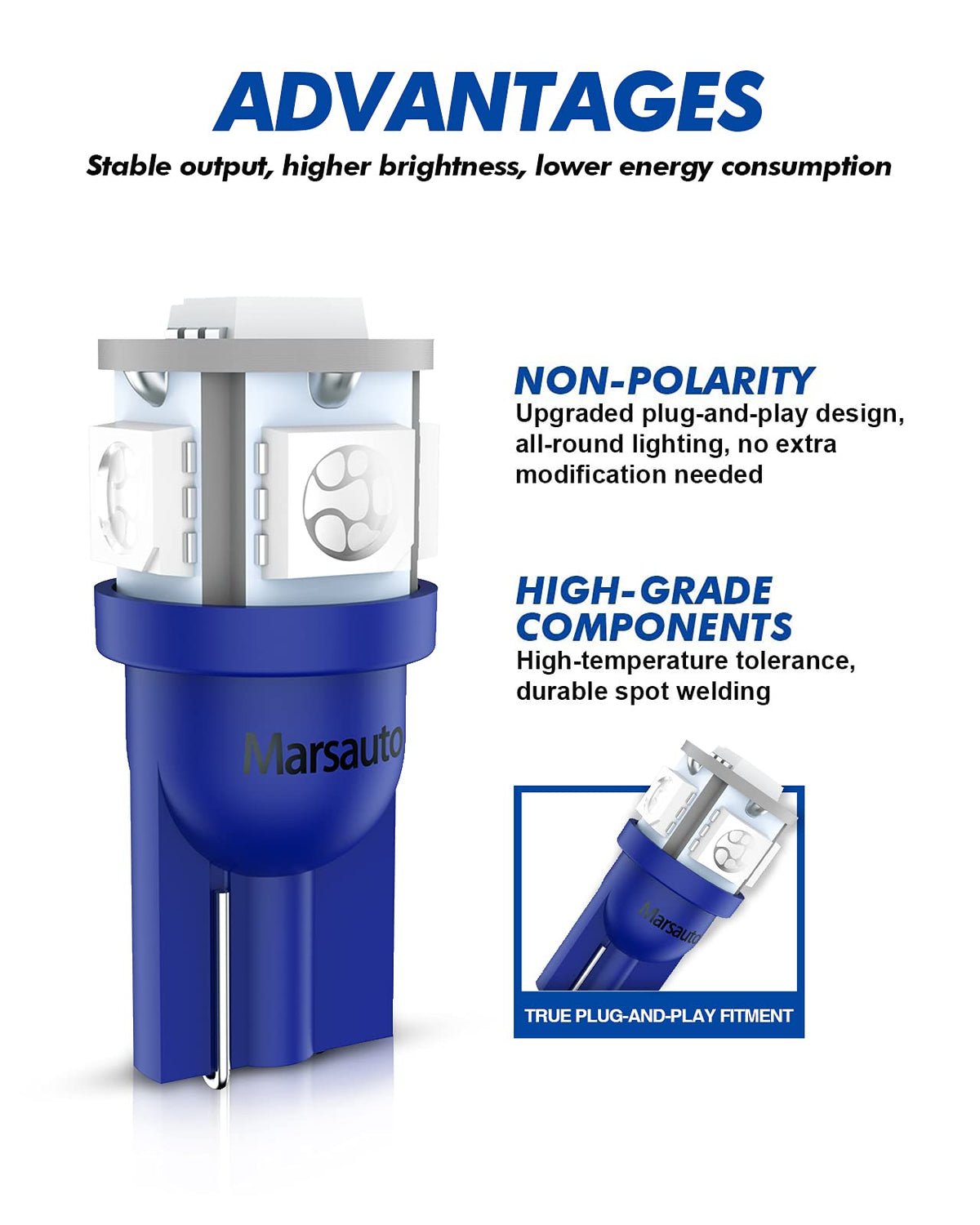 Fit bulb size: T10, 147, 152, 158, 159, 161, 168, 175, 184, 192, 193, 194 2825 W5W, 194 LED bulb can fit map light, dome light, license plate light, trunk light, courtesy light | Notice: 194 led bulbs could fit most of positions of car, do not fit all positions of your car, according to the year and model of your car, please double check owner's manual, for 12V vehicle | Better beam pattern: each bulb has 5 pcs high power SMD led, color:Blue, voltage: 12V | No polarity no flip: it is truly no polarity, can light on two sides, no need more modification or flip, plug and play, easy install within 5 minutes | Tips: 10 packs of 194 led bulbs of one set, for some vehicles, It may need a canbus decoder to fix flickering or error code