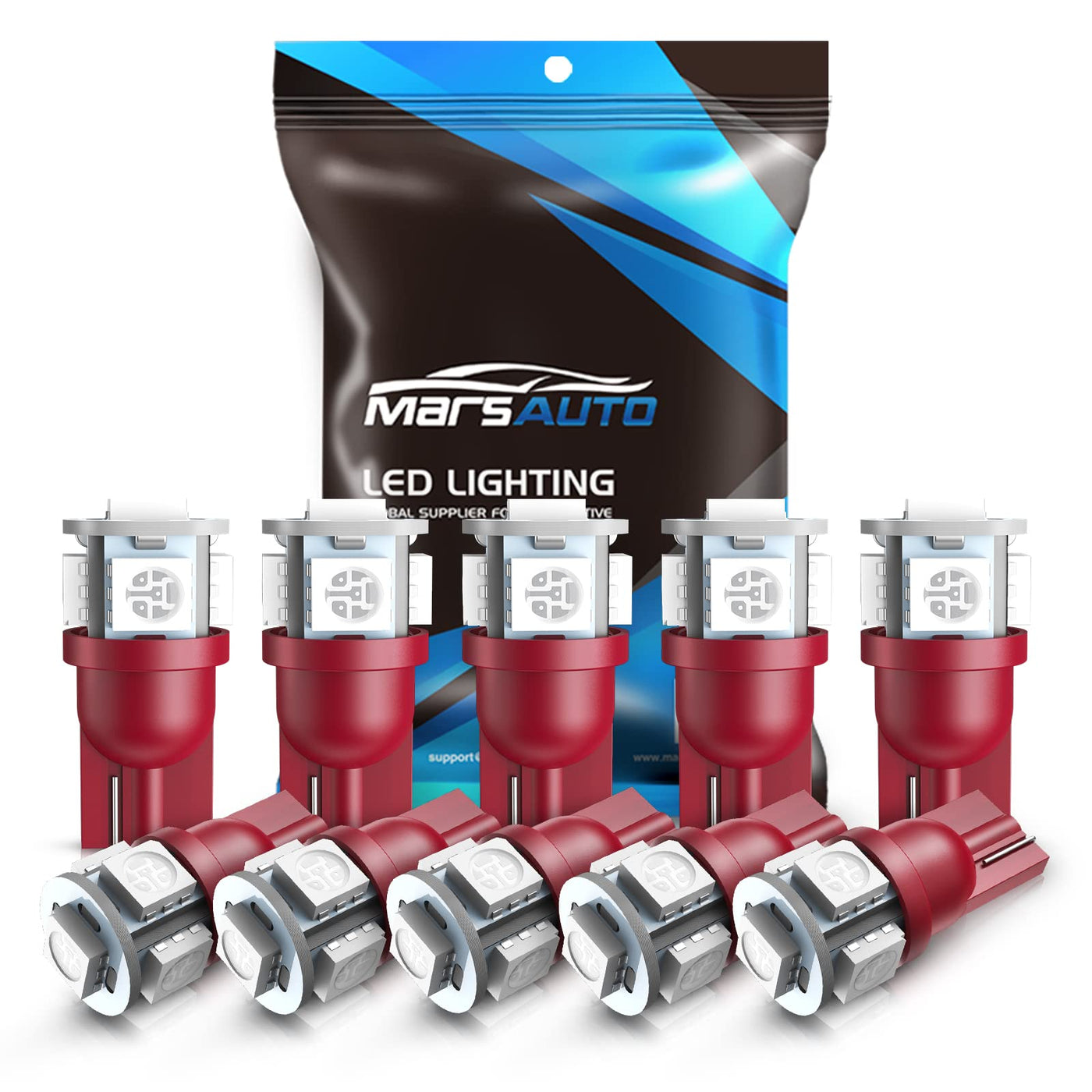 Fit bulb size: T10, 147, 152, 158, 159, 161, 168, 175, 184, 192, 193, 194 2825 W5W, 194 LED bulb can fit map light, dome light, license plate light, trunk light, courtesy light | Notice: 194 led bulbs could fit most of positions of car, do not fit all positions of your car, according to the year and model of your car, please double check owner s manual, for 12V vehicle | Better beam pattern: each bulb has 5 pcs high power SMD led, color: Brilliant Red, voltage: 12V | No polarity no flip: it is truly no polarity, can light on two sides, no need more modification or flip, plug and play, easy install within 5 minutes | Tips: 10 packs of 194 led bulbs of one set, for some vehicles, It may need a canbus decoder to fix flickering or error code