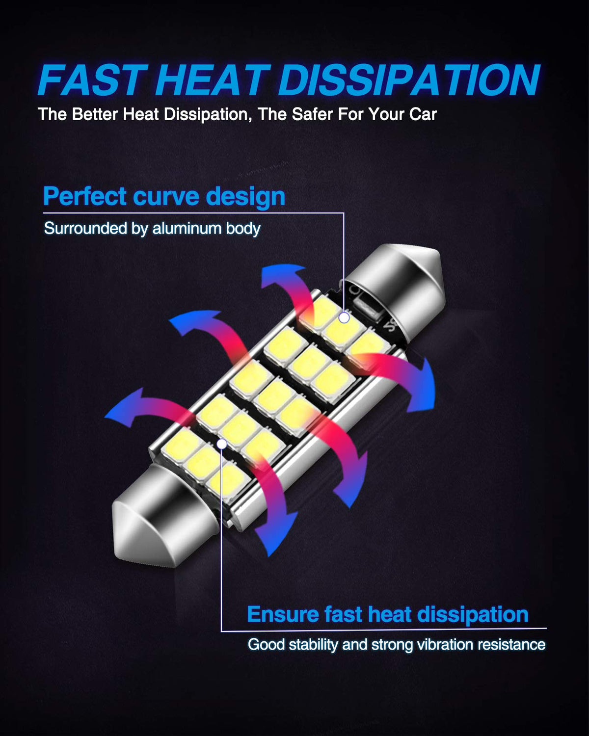 Replacement for part number : (Please Ctrl+F to confirm) 211-2 211, 211-2, 212, 212-2, 214-2, 569, 578, 6411, 6413, 6429, 12844, DE4410 Fit postion: 211-2 led bulb can be used as led interior car lights, led license plate light, led interior map light, led dome light, led reading light, dash board light, side door courtesy light, glove box light, trunk cargo room light, instrument lamp door light etc Specifications: Dimension: 41mm 42mm 1.66inch LED type: 4 x 2835-SMD chipsets Light color: super bright white Color temperature: 6500K Lumens: 400LM for each bulb Lifespan: more than 50000 hours service life Package including: 4 x white 41mm festoon bulbs Built in circuit for 12V DC power input Each bulb contains heat sink to prevent overheat Built in CANBUS controller, no pop out error, no flickering Plug and play, easy to install
