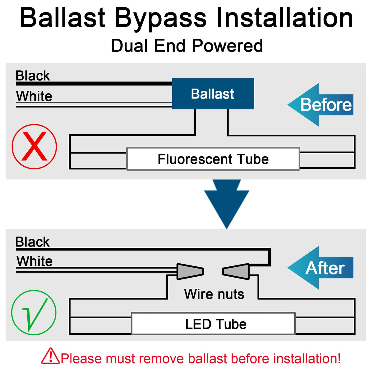Specification: LED Tube Type: Type B Input Voltage: AC 85-277V Rated Power: 24W (65W Equivalent) Color Temp: 6000K Super Bright Lumen(lm): 3000LM Beam Angle: 180 Base Type: G13 Bi-Pin Installation Way: Ballast Bypass Powered Way: Dual Ended Power Operated Temp: -20? to 50 ? Lens Type: Clear Dimmable: No Waterproof: No Length: 4 Foot Package: 12 Pack Warranty: 5 years Caution: 1. Turn off the power supply before installation. 2. Ballast bypass and dual end installation. 3. Do not use this tube with dimmers. 4. Installing the wrong type of LED tube can result in premature failures and potentially dangerous short-circuits and fire hazards, pls check the specs clearly before purchasing and installation.