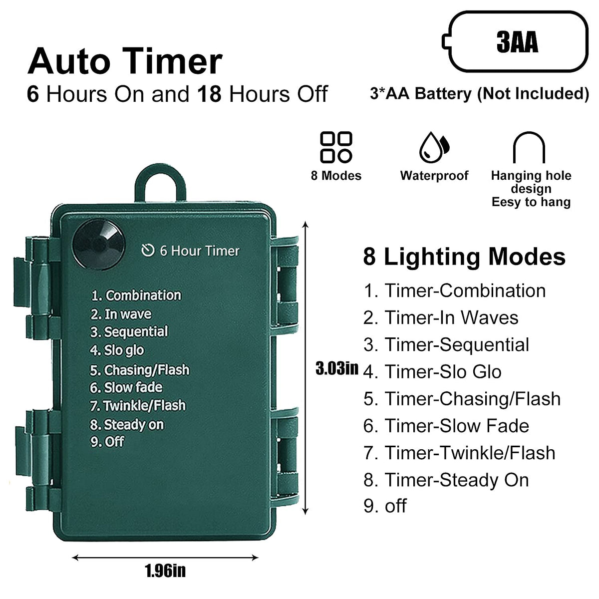 ?MULTI MODES MULTI HAPPY? These christmas lights are 8 different light modes including Combination,Wave, Sequential,Slo glo,Chasing/Flash,Slow fade, Twinkle/Flash, Steady On. Allow you to enjoy different light show, not a single day is boring day with this wonderful fairy lights. ?REMOTE CONTROL? Mini Christmas lights has a remote control that allows you to turn on your decorative lights at any time to illuminate your garden or room. ?SMART TIMER PROGARM? When you press the timer,the light will 6 hours on, 18 hours off, totally hassle-free. ?BRIGHTER THAN SOLAR VERSION? The string lights are powered by 4*AA 6V battery, while most solar string lights equipped equipped with 1.2V AA battery, the former is at least thrice brighter than the latter. ?SELF-ADJUSTMENT OF LIGHT BRIGHTNESS? The remote control has two brightness adjustment button, which can be increased or decreased to meet your lighting needs. ?NO LIMIT? No longer worry about the room there is no plug can’t use the light string decoration; No longer worried about the bad weather, string lights is not bright enough. At the same time, Waterproof IP65 rating, suitable for both outdoor and indoor. Basic parameters: Product length:about 10.18 meters / 39.5 feet LED head number:100LED Power supply:4*AA batteries Function: 8 modes Product packaging: 1 x Christmas string, 1 x remote control (without battery)