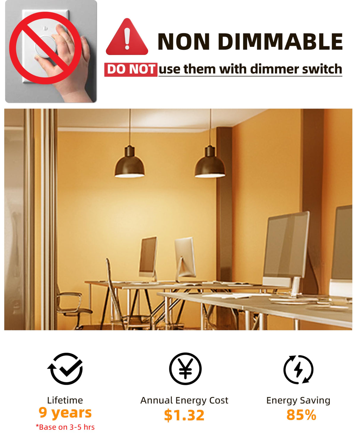 Mastery Mart Energy Efficient A19 LED Light Bulbs 9 Watt Helps to Save Energy & Money! Technical Specifications: Base Type: e26 medium screw base Material: Frosted Finish Power: 9 W=60 W incandescent bulbs. Voltage: 120V Color temperature: 2700K Warm White Colour Rendering Index (CRI): 80 Lumen: 800LM Dimmable: Non-Dimmable Light Source: SMD LED Lifespan: approx 10,000 hours What's in the box: 24-Pack A19 Bulbs Tips: If bulb damaged or burned out, please feel free to contact us and we will immediately arrange a refund or replacement.