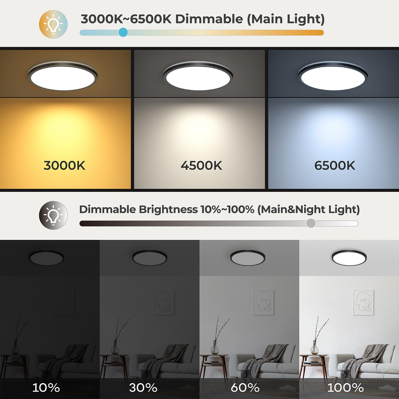 Q: What type of remote control options does this light have?A: The ceiling light comes with a remote control that enables you to easily adjust brightness, color temperature, and night light settings for optimal convenience.