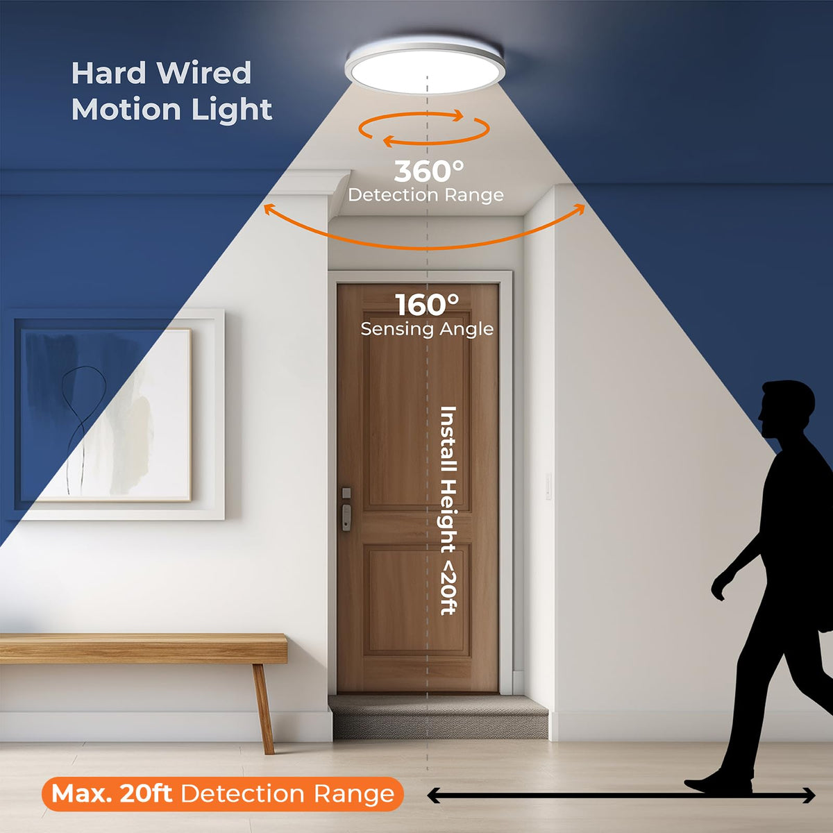 Q: What is the range of the motion sensor for the Matane Motion Sensor LED Ceiling Light?A: The Matane Motion Sensor LED Ceiling Light features an adjustable detection range of 3, 13, or 20 feet, allowing for versatile installation in various indoor spaces.