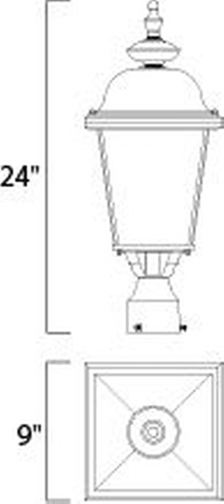 Q: What are the dimensions of the Maxim 3008BK post light?A: The Maxim 3008BK has a post mount height of 24 inches, with dimensions of 9.0 inches in length and 9.0 inches in width.