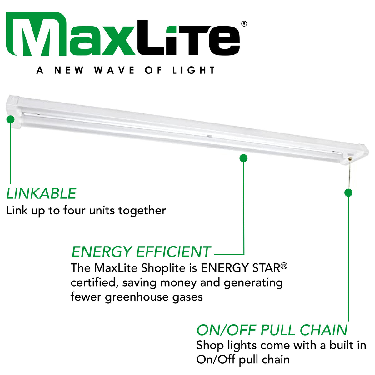 Q: Can I link multiple Maxlite Shop Lights together?A: Yes, you can link up to 4 units of the Maxlite Shop Light together for increased coverage, which is perfect for larger areas.