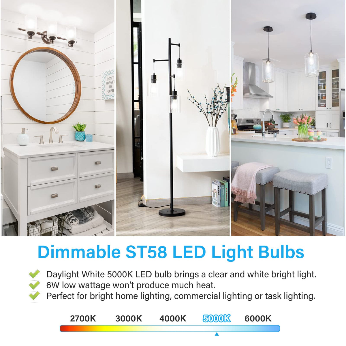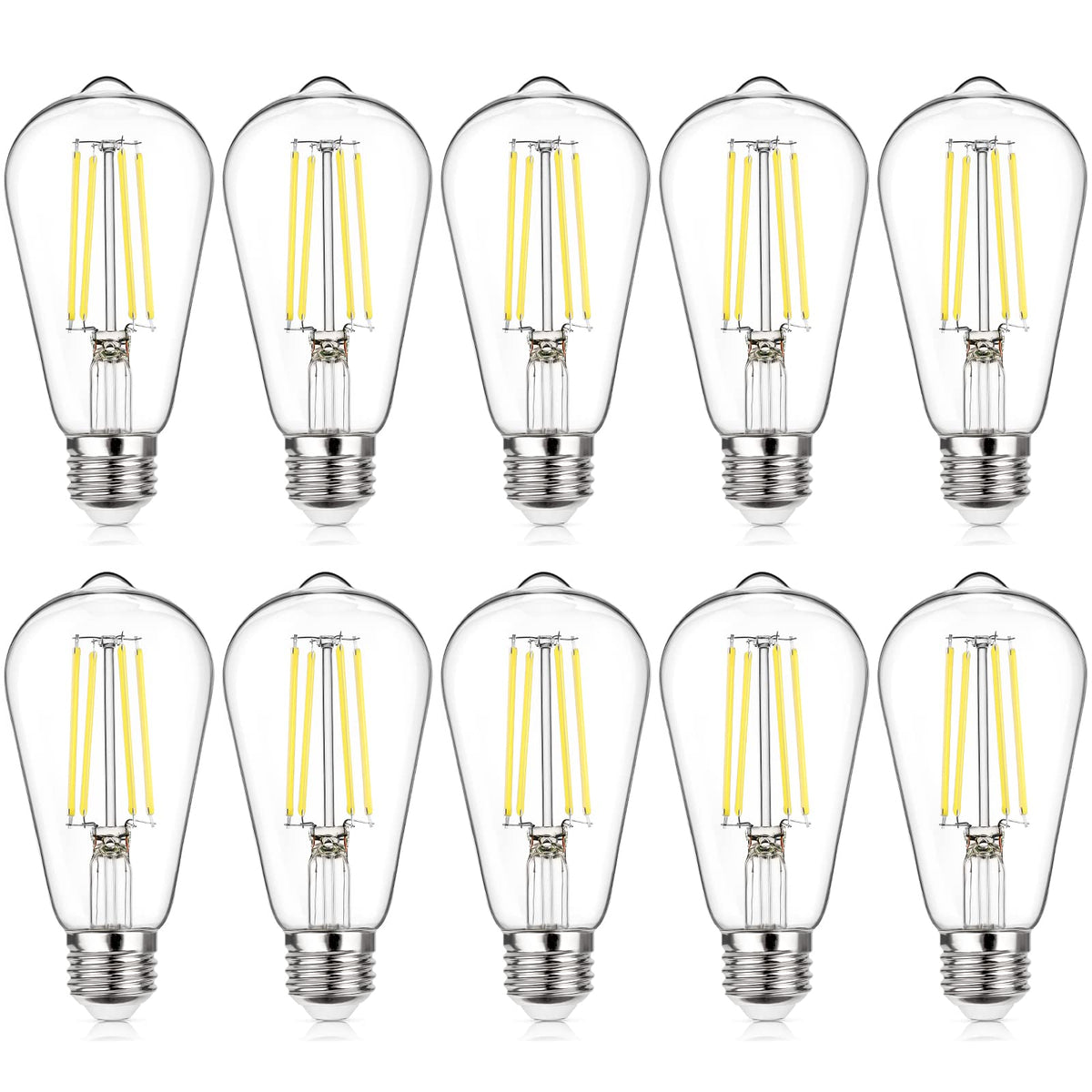 Technical Specifications: Lighting Technology: LED Color Temperature: 5000K Daylight White Bulb Shape: ST58 Size: 2.28*5.31inch Indoor/Outdoor: Indoor Light Bulb Base: E26 Medium Base(can be directly screwed into most light fixtures, such as pendant lights, chandeliers, vanity light fixtures, wall lanterns, floor lamps and table lamps.) Wattage: 6W(60W Equivalent) Light Output: 850 Lumens Color Rendering Index (RA):85+ Average Life: 25000+ Hours Dimmable: Smooth dimming form 100% to 10% brightness Beam Angle: 360 Degree Package Contents: 10 x LED Light bulbs (5000K Daylight White) < br >1 x User Manual Warranty: 24 Months