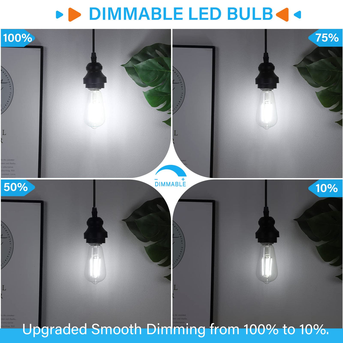 Q: Are these LED Edison bulbs dimmable?A: Yes, these bulbs feature smooth dimming capabilities, allowing you to adjust the brightness from 100% to 10% without flicker or buzzing.