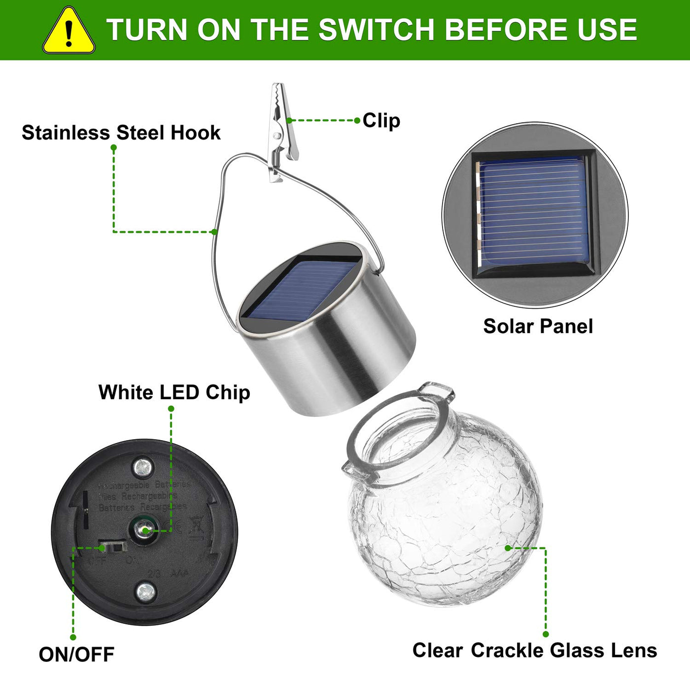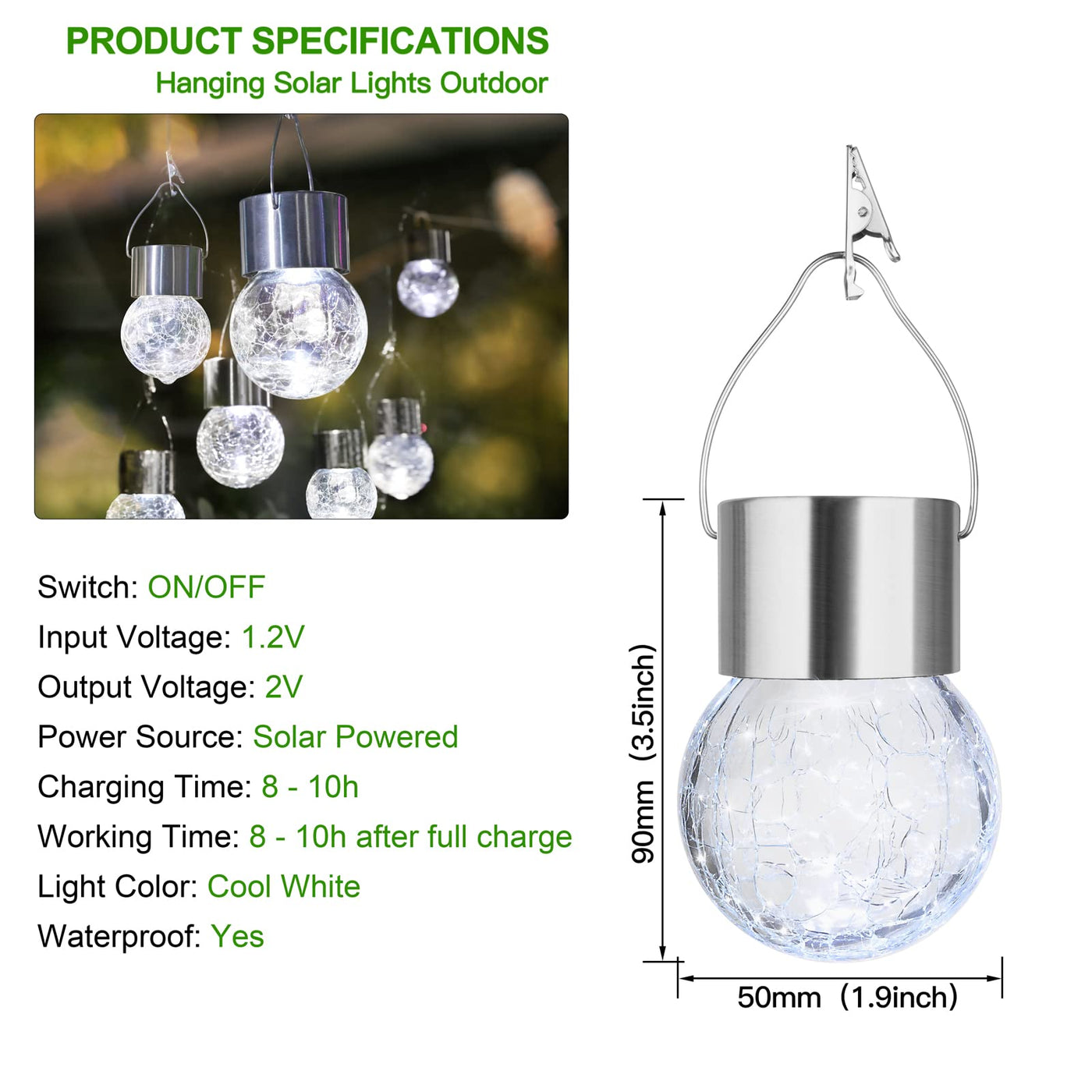 Use 12-Pack Hanging Solar Light Cool White to Create Bright and Natural Glow for Your Outdoor Space! < b > Cool White Light:< /b > < br > The cool white cracked solar light emits bright and natural atmosphere, which will enable you to enjoy a more comfortable outdoor time. < b > Suitable for Outdoor Use < /b > < br > The solar-powered lights cracked glass bring a delightful lighting for driveway, walkway, sideway, backyard, wedding, garden, fence, patio, umbrella, balcony, camping, pathway, outside decorations party or daily life. < b >Charging Time: < /b > < br >8-10 Hours. < b >Lighting Time: < /b > < br > 8-10 Hours. Size: 1.9*3.5inch < b >Features: < /b > < br >Automatically ON/OFF Weather Resistant High-efficient Solar Panel Energy-saving LED Chip < b >Material: < /b > < br >Stainless Steel+Crackle Glass+PP < b >Package Include: < /b > < br > 12 x Hanging Solar Lights Outdoor < br > 12 x Clips < br >1 x User Manual Warranty: 12 Months < b >Note: < /b > < br > 1. The plastic film on the panel should be removed and the switch inside should be turned ON before the first charging. 2. If the light doesn't light up, please try shifting the switch from ON to OFF and then back to ON again.