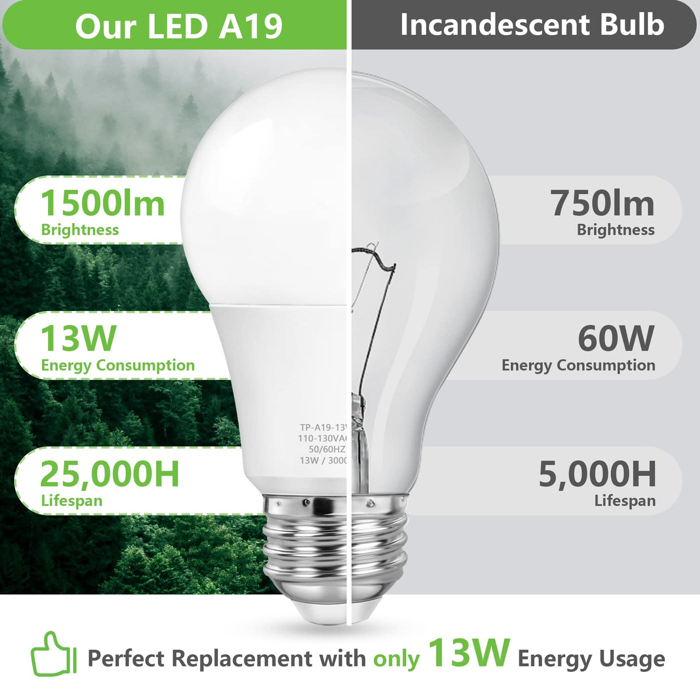 Technical Specifications: Lighting Technology : LED color Temperature (K) : 3000K Soft White Bulb Type : Household Bulb Shape : A-Line Indoor Light Bulb Base code : E26 Light Bulb Base Type : Medium Light Bulb Shape code : A19 Wattage (watts) : 13 Light Output (lumens) : 1500 High Lumens Watt Equivalence : 100w color Rendering Index (RA) : 85+ Input Voltage:120VAc Average Life (hours) : 25,000 Dimmable : Non-dimmable Package contents: 4 x LED Light bulbs (3000K Soft White)NOTE: 1 These LED bulb is not dimmable, please DO NOT use them with dimmer switch But prevent eye fatigue and provide instant bright light without buzzing or flickering, effectively protect your familiesA eyesight and health 2These lightbulbs can be used in the E26 base enclosed light fixtures Ideal for house, hotel, offices, restaurants or any other places 3It is a standard A19 shape which is 236*472 inches, good shape for commercial lights or any space that needs bright home lighting