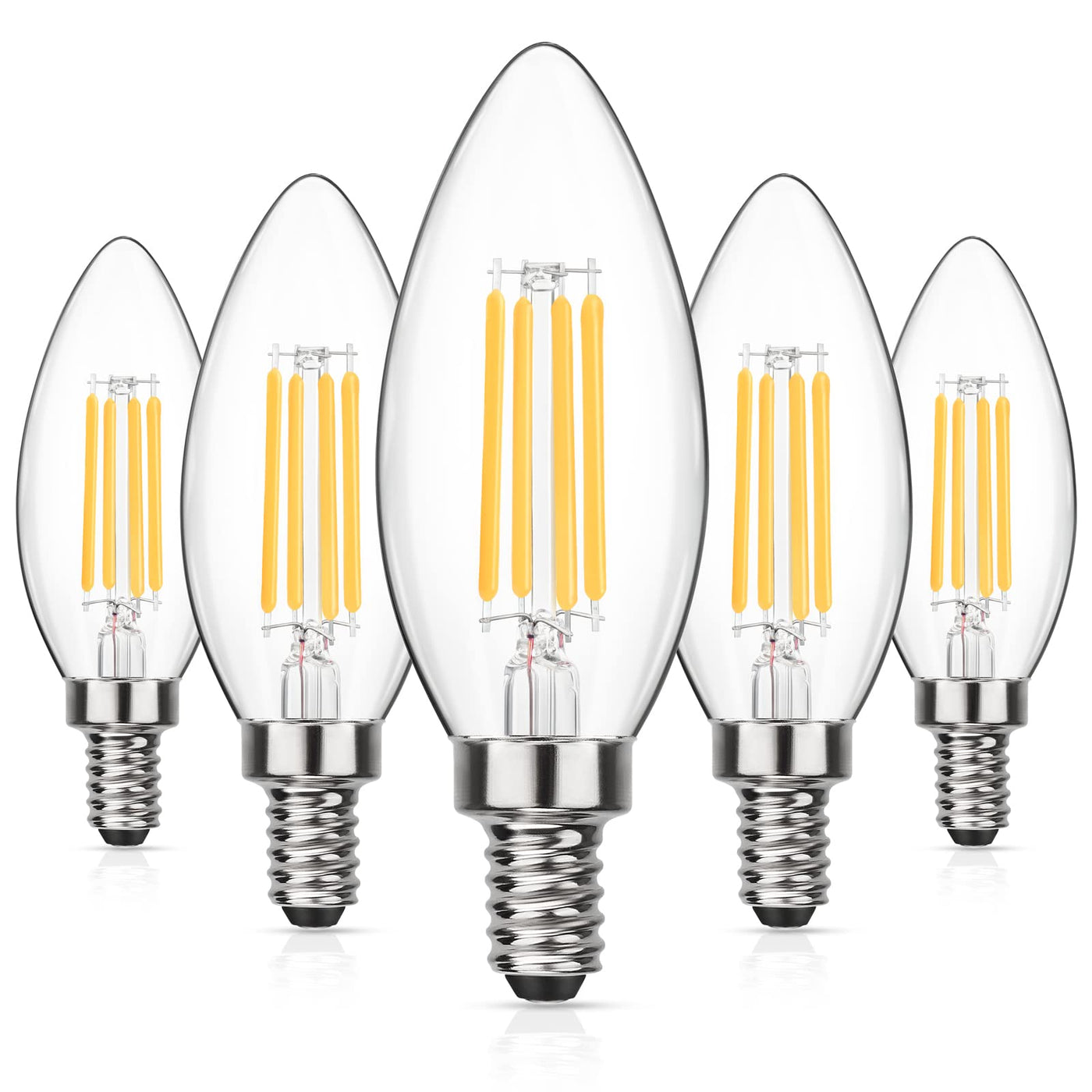 b > Lighting up every dark areas in your home b > br > Our 5-pack E12 chandelier led light bulbs perfectly combines aesthetic with modern technology, illuminating any surroundings in household or commercial areas ItAs very suitable to decorate the house and set the mood for the room These E12 LED candelabra bulbs are ideal for chandelier, ceiling fan, wall sconce, pendant light in living room, dining room, hallway, utility room, entryway, porch, foyer and so on b >Why choose Our candelabra Bulbs b > br > Saving Money -- Replace 60W equivalent by 5W br > Dimmable -- Adjust the brightness you want br > High cRI 85+ -- Show true color of your room br > 360 Beam Angle -- Light up every darkness br > 3000K Soft White -- Relax and pleasant br > No flicker -- Protect for your eyesight br > b > FAQ: b > br > b > Q: Are these candelabra bulbs dimmable b > br > A: b > Yes, these bulbs are dimmable br > b > Q: What is the size of the bulb b > br > A: b > The size of the bulb is 386*138inch98*35mm br > b > Q: can these bulbs be used outside b > br > A: b > Yes, these bulbs can be used outside, but please use them in an enclosedcovered light fixture