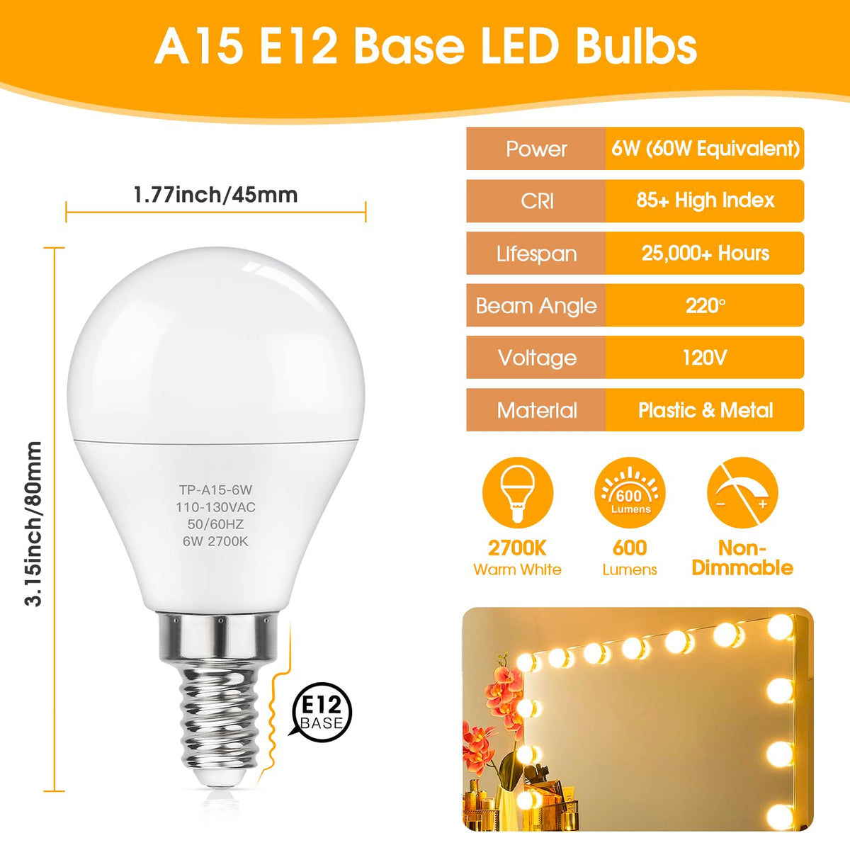Good Choice for the Decorative Lighting! Our 6W ceiling fan bulbs perfectly combines aesthetic with modern technology, illuminating any surroundings in household or commercial areas. It’s very suitable to decorate the house and set the mood for the room. These E12 LED candelabra bulbs are ideal for chandelier, ceiling fan, wall sconce, pendant light in living room, dining room, hallway, utility room, entryway, porch, foyer and so on. Why Choose Our Candelabra Base Light Bulbs? Saving Money -- Replace 60W equivalent by 6W. High CRI 85+ -- Show true color of your room. 2700K Warm White -- relax and comfortable. No flicker -- Protect for your eyesight. Package Includes: 6 x 6W E12 ceiling fan bulbs 2700K (Non-Dimmable, please DO NOT use it with dimmer switch or dimmable socket.) FAQ: Q: Are these E12 LED LIight Bulbs dimmable? A: No, these bulbs are NON-DIMMABLE. DO NOT use with dimmer switch or dimmable socket.