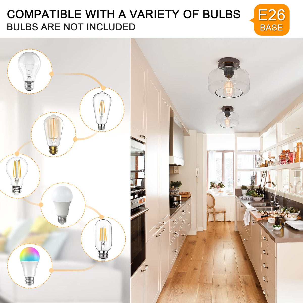 ?Specifications Voltage: 120Vac Maximum Wattage: 60W Frequency:50/60Hz Base Type: E26 Base Material: Metal & Glass Color: Oil Rubbed Bronze Style: Antique, Vintage Bulb Not Included ?Package Include 1 X Glass Shade 1 X Metal Base 1 X User Manual ?Installation Procedures 1.Unscrew The Mounting Plate From The Base; 2.Attach The Mounting Plate To The Wiring Box; 3.Connect The Wires Separately; 4.Screw The Base Back To The Mounting Plate; 5.Unscrew The Fixing Ring From The Metal Base; 6.Fix The Glass Shade To The Metal Base By Tightening The Fixing Ring; 7.Install An E26 Base Bulb (Not Included).Note: 1. Please Consult A Qualified Electrician If You Are Not Sure How To Install.2.These Ceiling Lights Can Be Used In The E26 Base Lightbulbs. Ideal For House, Hotel, Offices, Restaurants Or Any Other Places! 3.The Semi-Flush Ceiling Light Is 4.72*7.09 Inches, Good Shape For Commercial Lights Or Any Space That Needs Bright Home Lighting.