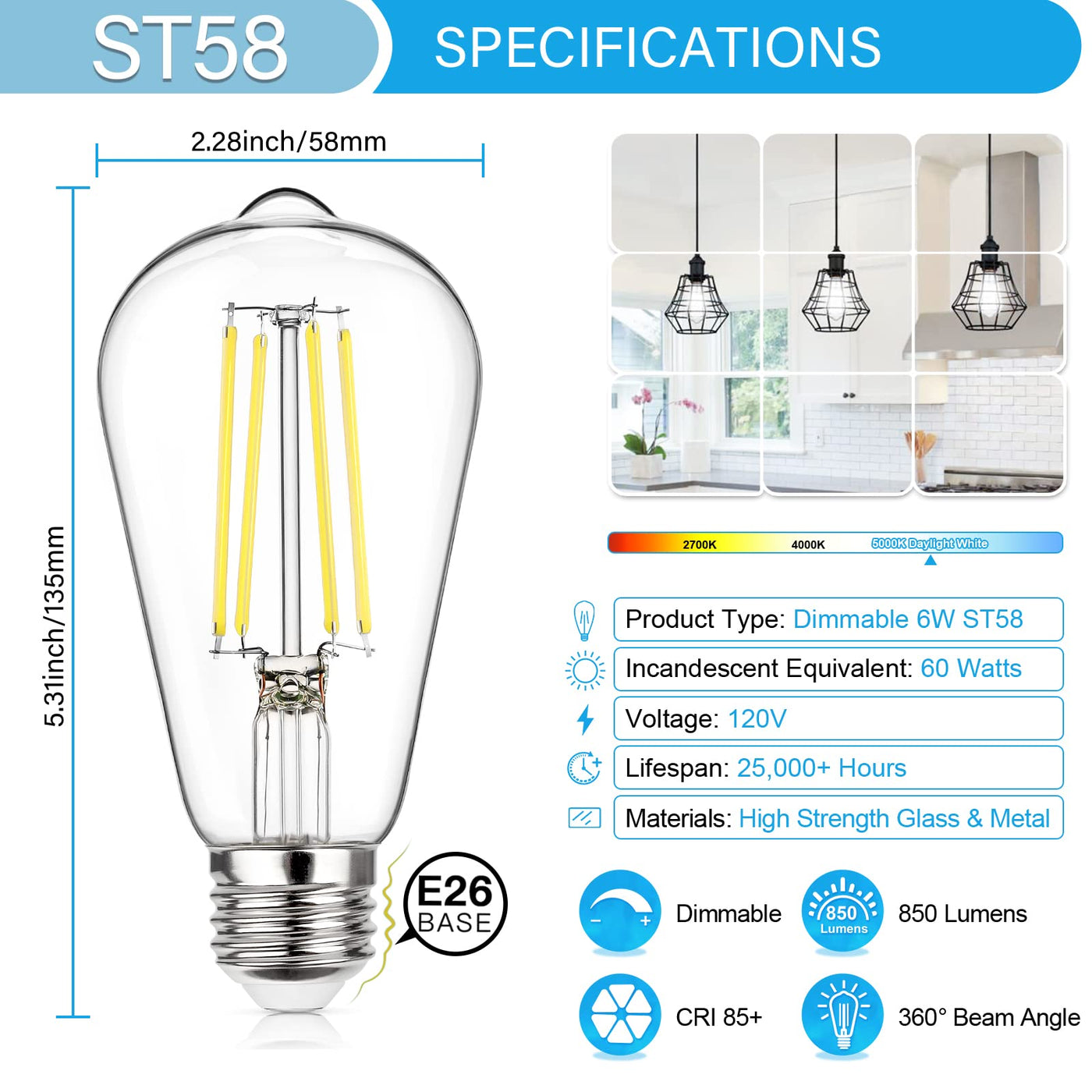Technical Specifications: Lighting Technology: LED Color Temperature: 5000K Daylight White Bulb Shape: ST58 Size: 2.28*5.31inch Indoor/Outdoor: Indoor Light Bulb Base: E26 Medium Base(can be directly screwed into most light fixtures, such as pendant lights, chandeliers, vanity light fixtures, wall lanterns, floor lamps and table lamps.) Wattage: 6W(60W Equivalent) Light Output: 850 Lumens Color Rendering Index (RA):85+ Average Life: 25000+ Hours Dimmable: Smooth dimming form 100% to 10% brightness Beam Angle: 360 Degree Package Contents: 4 x LED Light bulbs (5000K Daylight White) < br >1 x User Manual Warranty: 24 Months