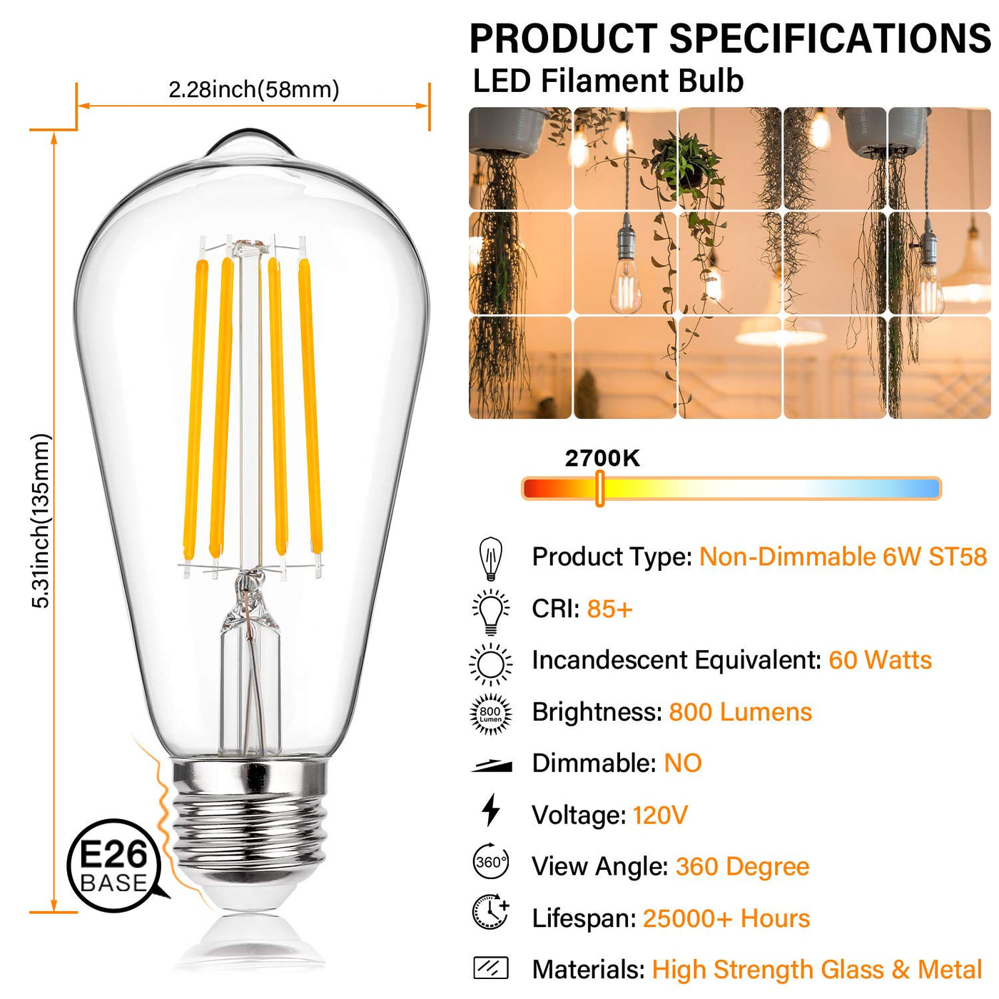 Technical Specifications: Lighting Technology : LED color Temperature (K) : 2700K Warm White Bulb Type : Household Bulb Shape : ST58 Indoor Light Bulb Base code : E26 Light Bulb Base Type : Medium Light Bulb Shape code : ST58 Wattage (watts) : 6 Light Output (lumens) : 800 High Lumens Watt Equivalence : 60w color Rendering Index (RA) : 85+ Input Voltage:120VAc Average Life (hours) : 25,000 Dimmable : Non-dimmable Package contents: 12 x LED Light bulbs (2700K Warm White)NOTE: 1. These LED bulb is not dimmable, please DO NOT use them with dimmer switch. But prevent eye fatigue and provide instant bright light without buzzing or flickering, effectively protect your families eyesight and health. 2.These lightbulbs can be used in the E26 base enclosed light fixtures. Ideal for house, hotel, offices, restaurants or any other places 3.It is a standard ST58 shape which is 2.28*5.3 inches, good shape for commercial lights or any space that needs bright home lighting.