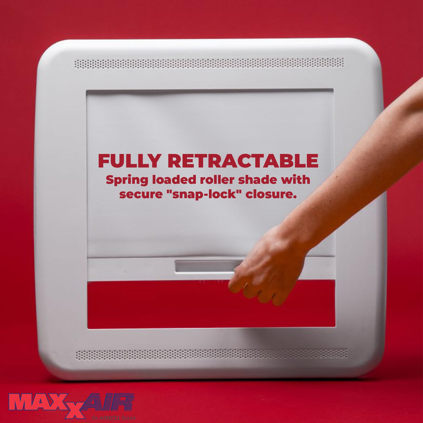 Enjoy the comfort, style and convenience offered by Maxxair Maxxshade RV Window Shades, allowing you to relax in your RV cool and comfortable even on the hottest days. Maxxshade is the perfect solution for blocking out sunlight and UV rays to stay cool and comfortable, day and night. Its fully retractable spring-loaded roller shade has a secure snap-lock closure and can be opened or closed with the touch of a button. The shade material has a reflective backing to block light and reflect heat, so it wont interfere with the normal operation of a roof vent or powered ventilation fan.