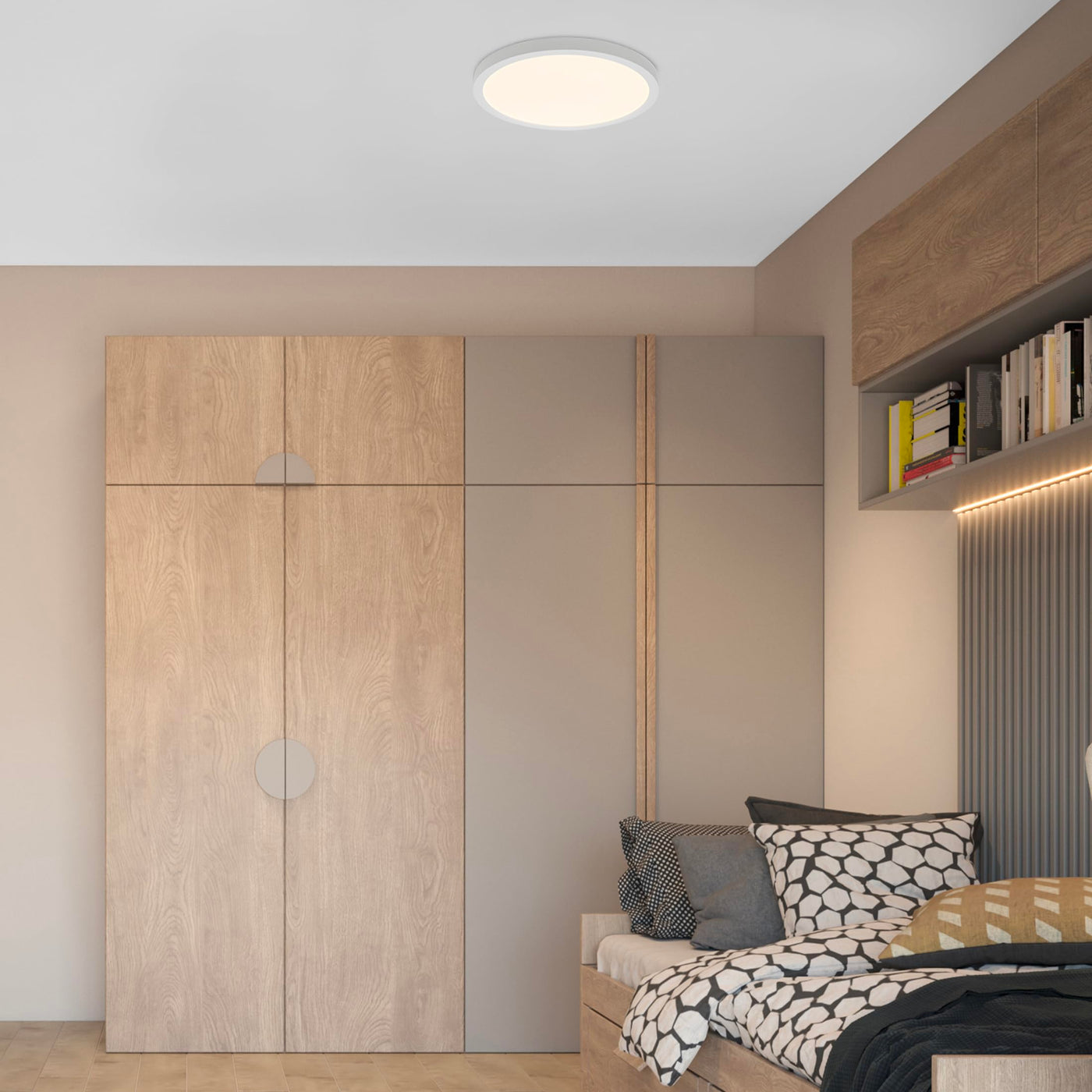 This 14-inch LED panel ceiling light has a low profile design, white trim finish and is only 1 inch in depth. It is color selectable allowing you to choose the proper lighting for your installation from 2700K, 3000K, 3500K, 4000K and 5000K. It is an energy-efficient disk light that uses only 25 watts of energy, equivalent to a 160-watt incandescent light. It produces 2500 lumens of soft white, warm white, bright white, neutral white or daylight giving you the ability to easily choose your preferred color temperature by utilizing the switch on the back of the fixture. This LED round panel light features driver-on-board technology and is easily mounted onto a standard junction box. This flush mount ceiling light is perfect for laundry rooms, bedrooms, entryways, mudrooms, closets, hallways, apartments, condos and more. It is also suitable for damp locations making it perfect for outdoor soffits, breezeways and other covered outdoor settings. Its dimmable feature allows you to choose the proper brightness for any placement. Mounting hardware is included as well as a detailed instruction manual. This light is ETL listed and comes with a 3-year warranty.