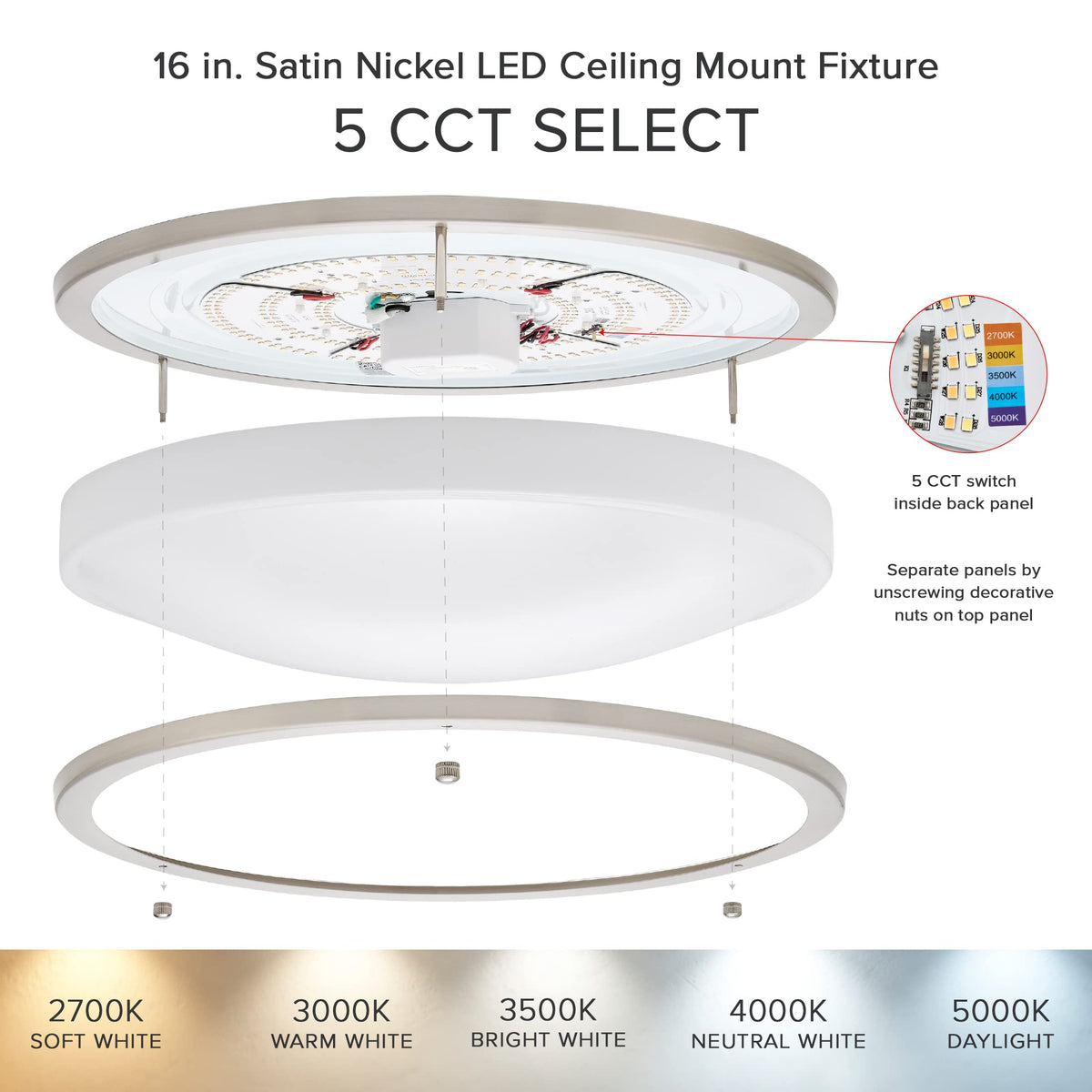 This Sleek Ceiling Mount Fixture Brings The Perfect Ambient Light To Any Location. This Color Selectable Round Ceiling Light Allows You To Choose The Proper Lighting For Your Installation From 2700K, 3000K, 3500K, 4000K And 5000K. It Is An Energy-Efficient Flush Mount Light That Uses Only 34 Watts Of Energy, Equivalent To A 170-Watt Incandescent Light. It Produces 3600 Lumens Of Soft White, Warm White, Bright White, Neutral White Or Daylight. The Satin Nickel Trim Of This Fixture Gives A Modern/Contemporary Look And Feel To Your Home. This Energy-Efficient Light Can Be Installed In Bedrooms, Kitchens, Hallways, Hotels, And Stairways For Both Commercial And Residential Uses. The Versatility, Ability To Operate In Damp Locations, And 50,000 Lifetime Hours Make This An Ideal All-Purpose Lighting Option. The 5 Cct Color Select Fixture Is Ideal For Contractors So They Can Easily Select The Color Temperature Their Customer Desires. With Full Instructions And Mounting Hardware Included, This Light Can Be Installed By Anyone. Backed For 3 Years By Maxxima This Led Fixture Will Save You Energy And Money.