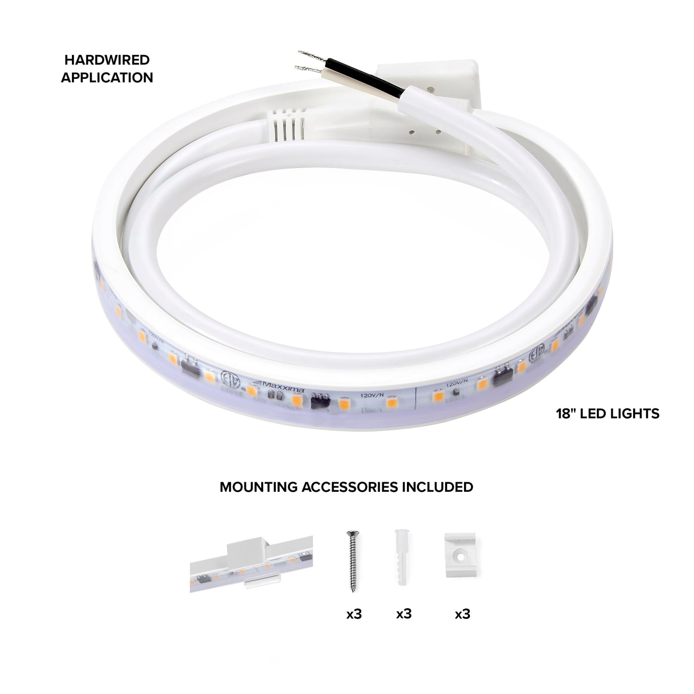 This Cutting-Edge 18'' Under-Cabinet Led Strip Light Fixture Is Designed To Illuminate Your Space With Unparalleled Brilliance. This Energy-Efficient Cove Light Can Be Easily Mounted With The Included Screws And Mounting Clips To Any Desired Surface, Including Cabinets, Counters, Bathrooms, Pantries, Closets, Crown Molding Or Any Area Where Task Lighting Is Essential. This Light Is Also Rated For Outdoor Use When Installed In A Weatherproof J-Box With Gfci Breaker. This Unique Strip Light Is Easy To Install, Wiring Directly To Your 120V Ac Power Source, With No Driver Or Power Supply Needed. The 2 Foot Cord Allows For Ample Length To Hardwire Your Fixture Ensuring A Stable And Permanent Installation To Deliver Consistent And Reliable Illumination For Years. With An Impressive 690 Lumens Of Radiant 3000K Warm White Light, This Under Counter Light Adds The Perfect Accent Lighting To Your Space While Using Only 9 Watts Of Energy. Its Compact, Low-Profile Sleek Design Of Only 0.26'' Depth Seamlessly Integrated Into Your Cabinetry, Providing Discreet And Modern Lighting Solutions. Experience The Perfect Blend Of Functionality And Aesthetics As You Transform Your Environment With This High-Performance Lighting Solution. This Under Cabinet Light Fixture Is Etl Listed And Is Backed By Maxxima For 3 Years.