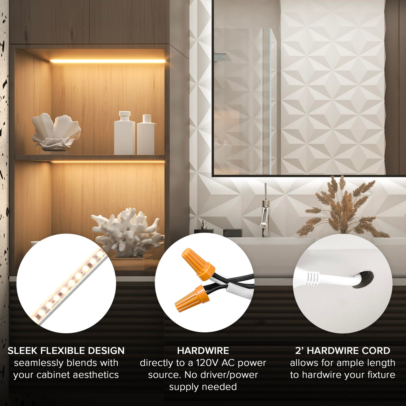 Q: What is the installation process for this hardwired LED strip light?A: The installation is straightforward; the fixture connects directly to a 120V AC power source without the need for a driver or power supply. It comes with screws and mounting clips for easy attachment to cabinets or desired surfaces.