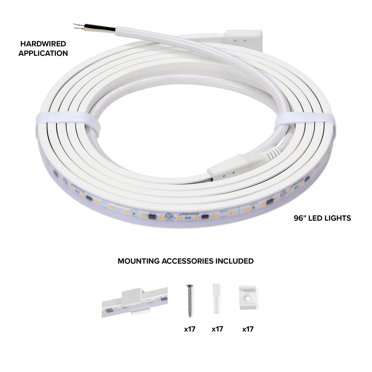This cutting-edge 96under-cabinet LED strip light fixture is designed to illuminate your space with unparalleled brilliance. This energy-efficient cove light can be easily mounted with the included screws and mounting clips to any desired surface, including cabinets, counters, bathrooms, pantries, closets, crown molding or any area where task lighting is essential. This light is also rated for outdoor use when installed in a weatherproof j-box with GFCI breaker. This unique strip light is easy to install, wiring directly to your 120V AC power source, with no driver or power supply needed. The 2 foot cord allows for ample length to hardwire your fixture ensuring a stable and permanent installation to deliver consistent and reliable illumination for years. With an impressive 3680 lumens of radiant 3000K warm white light, this under counter light adds the perfect accent lighting to your space while using only 48 watts of energy. Its compact, low-profile sleek design of only 0.26'' depth seamlessly integrated into your cabinetry, providing discreet and modern lighting solutions. Experience the perfect blend of functionality and aesthetics as you transform your environment with this high-performance lighting solution. This under cabinet light fixture is ETL Listed and is backed by Maxxima for 3 years.