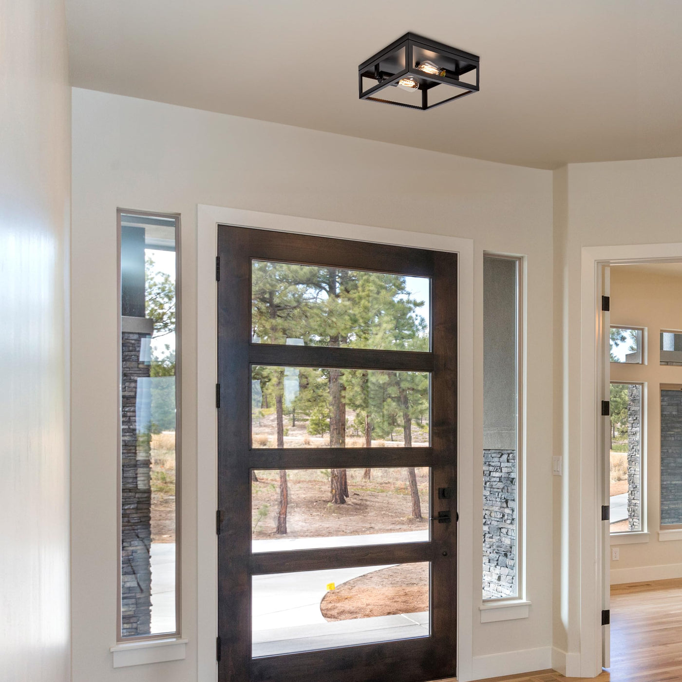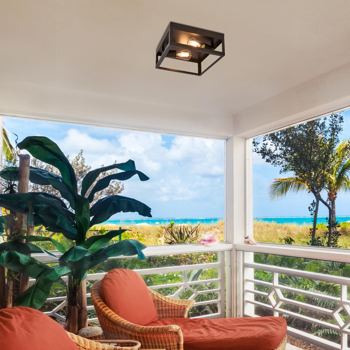 Maxxima Indoor/Outdoor Flush Mount Ceiling Light Fixture, 2-Light Square Farmhouse Close To Ceiling Entryway Light, Black, Bulbs