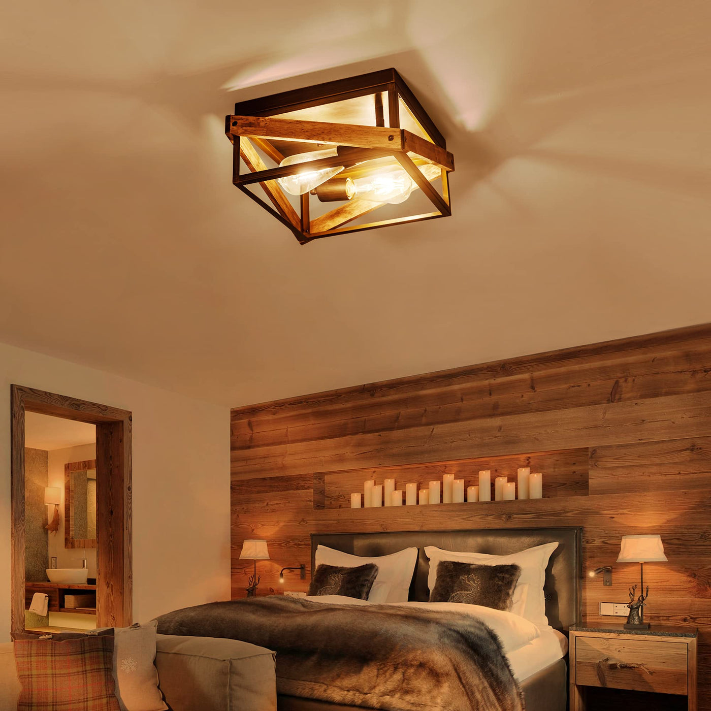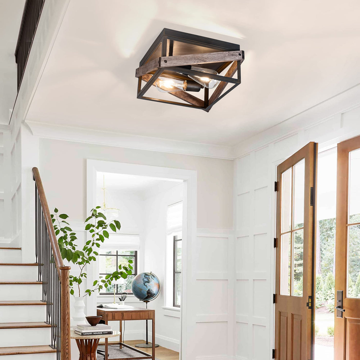 Mayful 2-Light Flush Mount Ceiling Light, Rustic Brown Metal & Wood Fixture for Kitchen, Living Room, Bedroom, Entryway, Hallway