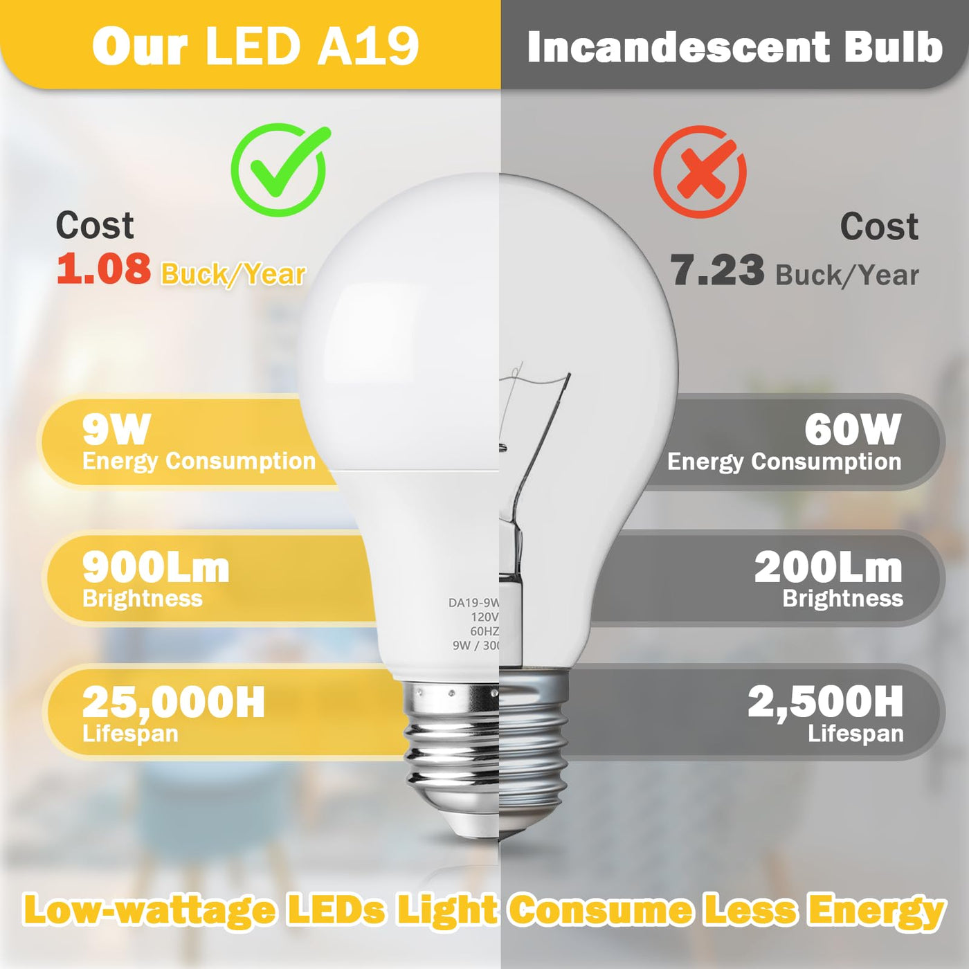 Q: What makes these LED bulbs energy-efficient?A: The Maylaywood A19 LED light bulbs consume only 9 watts of power while providing the same light output as a traditional 60-watt incandescent bulb, significantly reducing energy consumption and lowering electricity bills.