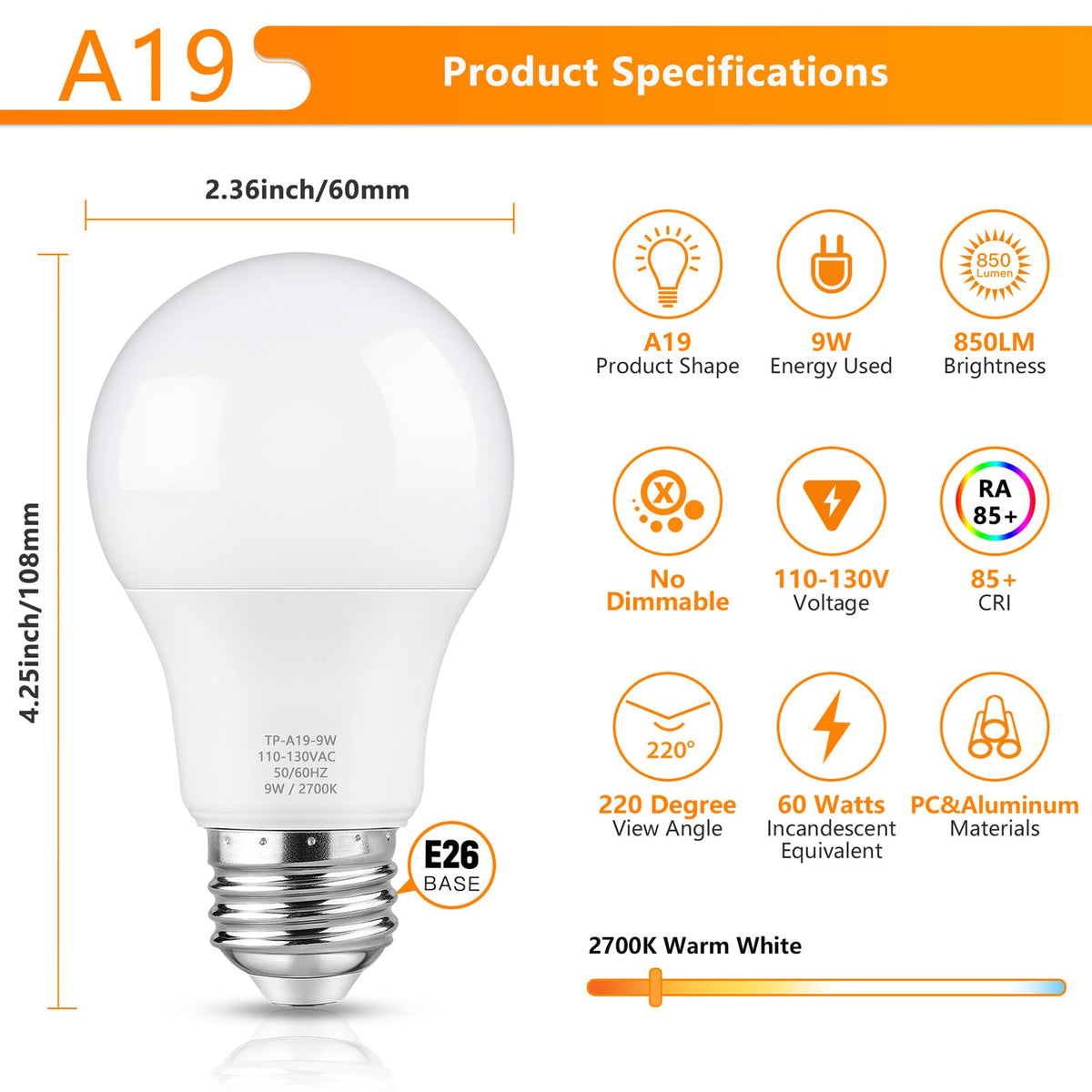 Technical Specifications: Lighting Technology : LED Color Temperature (K) : 2700K Warm White Bulb Type : Household Bulb Shape : A-Line Indoor Light Bulb Base Code : E26 Light Bulb Base Type : Medium Light Bulb Shape Code : A19 Wattage (watts) : 9 Light Output (lumens) : 850 High Lumens Watt Equivalence : 60w Color Rendering Index (RA) : 85+ Input Voltage:120VAC Average Life (hours) : 25,000 Dimmable : Non-dimmable