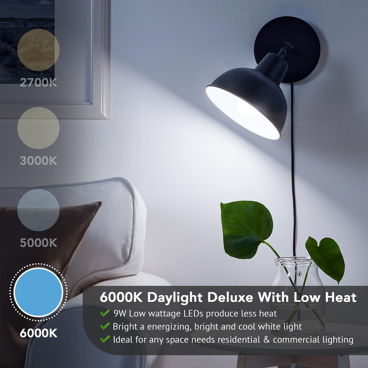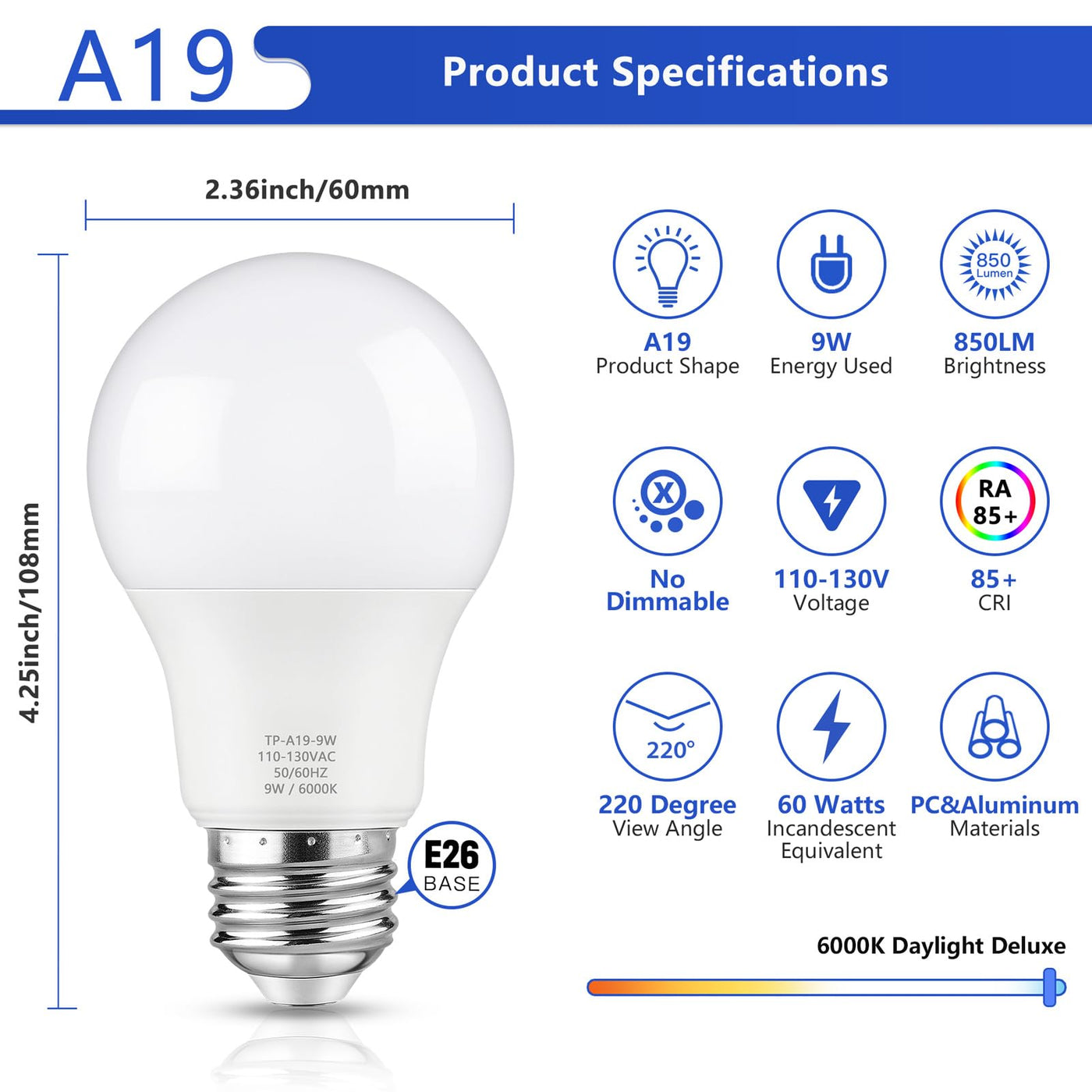 Technical Specifications: Lighting Technology : LED Color Temperature (K) : 6000K Cool White Bulb Type : Household Bulb Shape : A-Line Indoor Light Bulb Base Code : E26 Light Bulb Base Type : Medium Light Bulb Shape Code : A19 Wattage (watts) : 9 Light Output (lumens) : 850 High Lumens Watt Equivalence : 60w Color Rendering Index (RA) : 85+ Input Voltage:120VAC Average Life (hours) : 25,000 Dimmable : Non-dimmable
