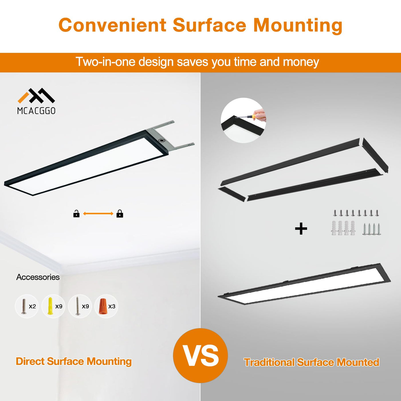 Q: How easy is it to install the Mcacggo 1x4 LED Flat Panel Light?A: Installation is straightforward with this ultra-thin surface mount LED light. It comes with an integrated frame and panel, and can be directly mounted on the ceiling or wall, making it an easy-install solution.