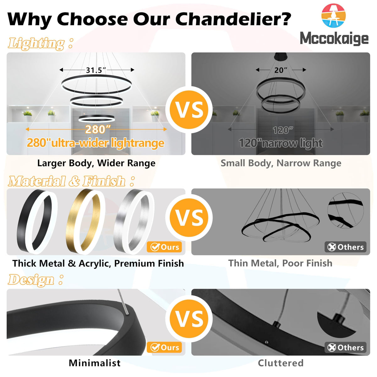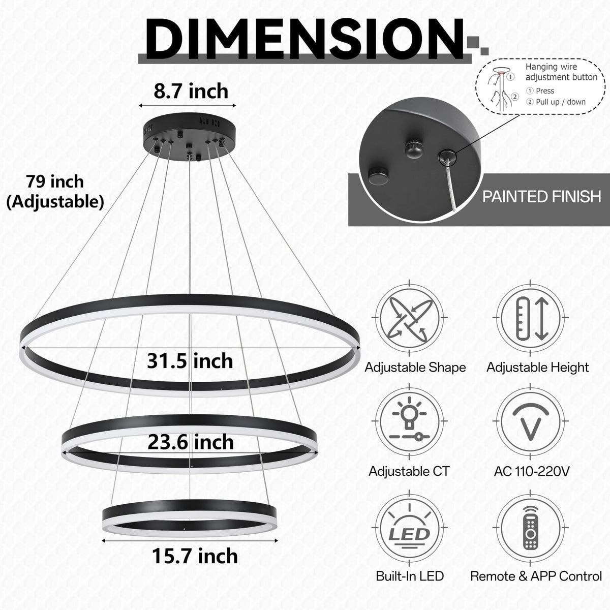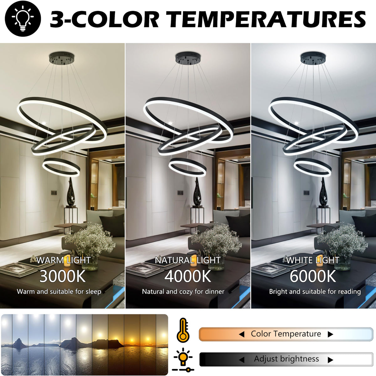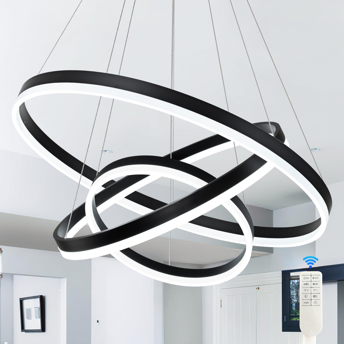 Mccokaige 31.5'' Black Modern Led Chandelier 3 Ring Modern Led Pendant Light Contemporary Ring Chandeliers Dimmable Chandeliers