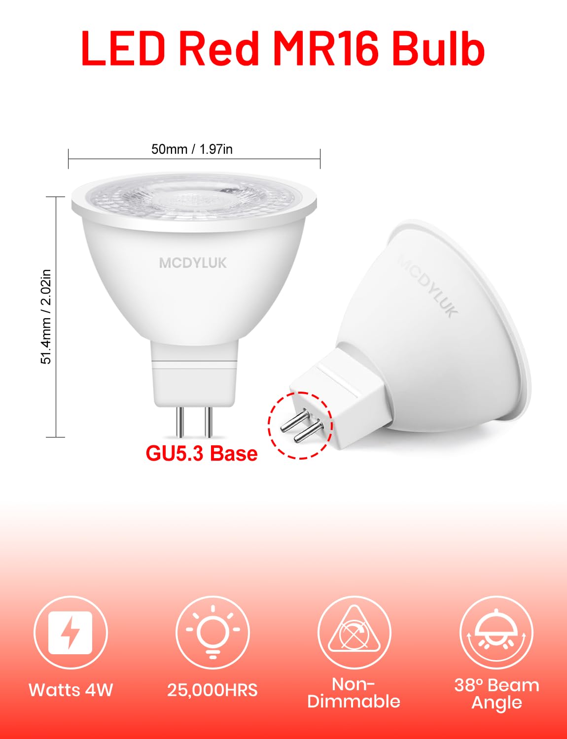Mcdyluk Led Mr16 Red Light Bulb 4W 20W 35W 50W Halogen Equivalent 12V Low Voltage Gu5.3 Bi-Pin Led Red Bulbs For Christmas Outdoor Landscape Yard Garden Tree Pool Holiday Lighting 38 Deg 6 Pack