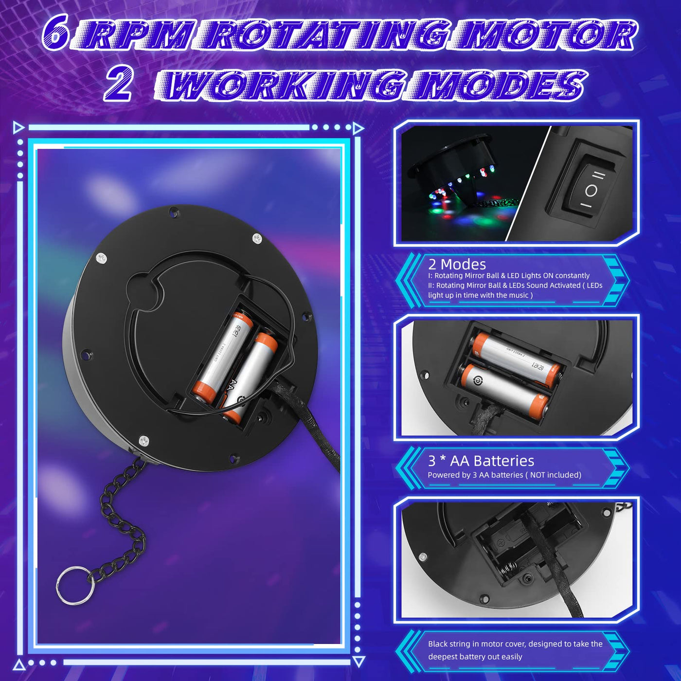 Meagoo 6RPM Rotating Mirror Ball Motor with Lights Hanging Disco Lighting Ball for DJ Club Stage Party Wedding Holiday Decoration Premium Features 6 RPM Rotating Speed: The rotating speed is about 6RPM. The motor turns on when you flip the on switch. It will spin smoothly and continuously in one direction even without a disco ball on it. Making sure that all of your audience fully sharing the effect of mirror ball light. 4 LED Light Colors & 18 LEDs: Colorful light colors, including red, white, green and blue. Very pretty colors to make your home look so magical and take your party up a few notches. 2 Working Modes: Except Always ON in mode I, the light can be also activated in time with music in mode II, you could choose your desired mode to meet your needs. Chain and O Ring: Making this spinning motor simple and safe to install with the mirror ball, bringing you a nice using experience. Wide Application: Disco ball works great for disco party use, you can use it to catch the sunrise, great idea of birthday present, also for DJ, band, wedding, etc, this magnificent sphere of tiny shiny mirrors will blast you back 50 years. Installation Guide 1. Fix the disco ball to the chain. 2. Insert the batteries (not included) into the battery compartment. 3. Hanging the Disco Ball Light in a suitable place. 4. Switch ON at the side of motor and set your desired mode. Warm Tips Please install the batteries according to the picture guide, here is a black string for easy taking out of the deepest inserted battery. Although the mirror ball packed with 4 foams and bubble bag for secure packing, there might be still some splinters because of the delivery, please be careful when the first time to take out. If there is any imperfection after receiving, be free to message us with your amazon order and pictures about it. We will be here to make it right. Specifications Ball size: 8 Inch Ball weight: 1.16 LBS Motor Size: 5''(D)*3''(H) Chain Length: 8'' (Including Bottom Ring) Total Length After Installing: About 20'' Powered By: 3 * AA Batteries (NOT Included) Package Weight: 2.1 LBS Package Dimension: 11.8'' * 7.8'' * 7.8''