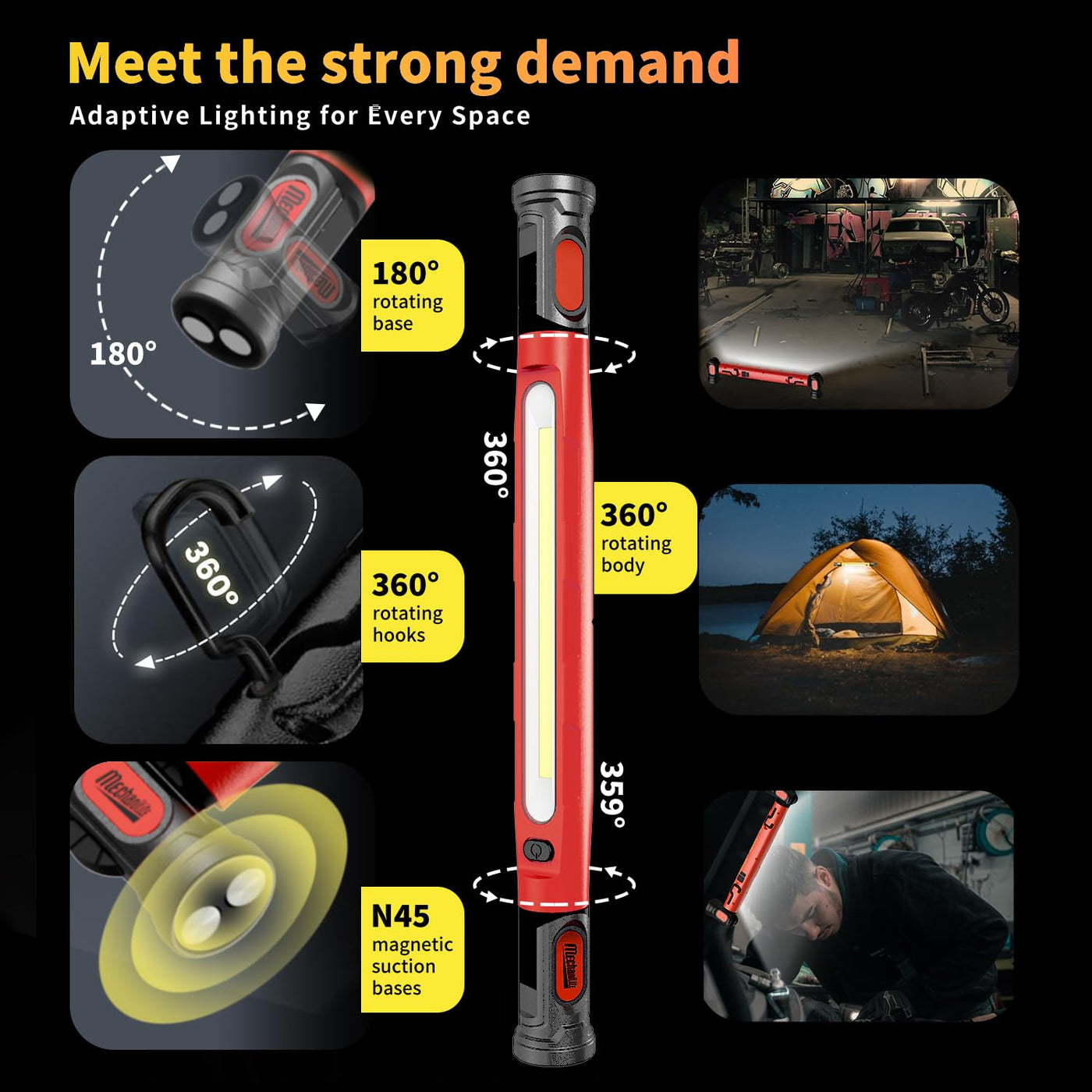 Mechanilite Under Hood Work Light Bar 3000Lm Led Magnetic Light Bar With Hooks 5200Mah Cordless Rechargeable Hood Light For Mechanic/Car Repairing/Garage-Red