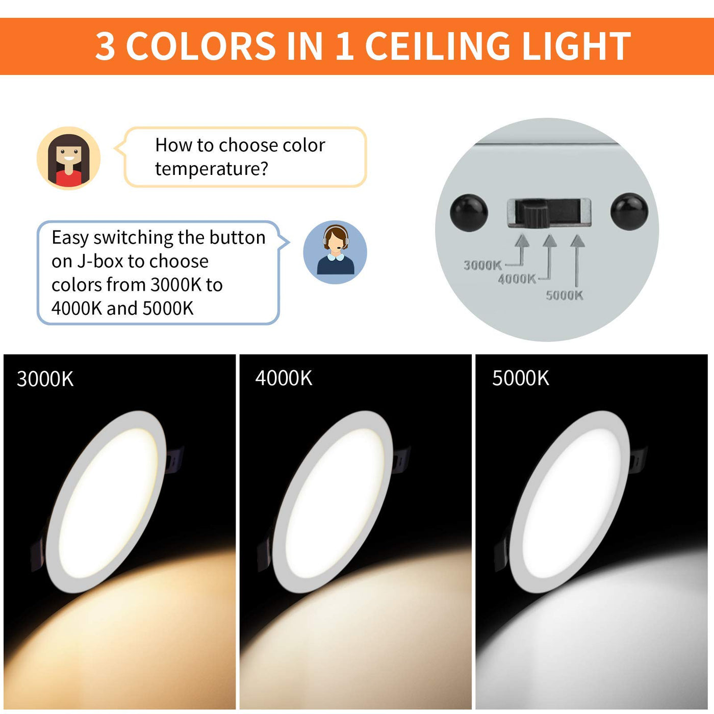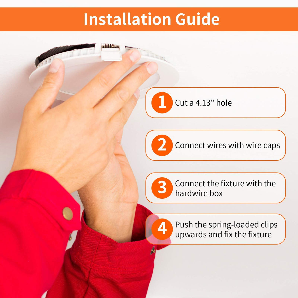 ?The Right Color Temperature for Your Mood?Still worried about how to choose the right color temperature for your living room/ kitchen/bathroom /bedroom/garage/warehouse. Then our three-color temperature (3000K/4000K/5000K) canless LED recessed light can meet your requirements. Choose the color you need by switch the button on junction box. | ?IC Rated?This canless LED recessed light is IC rated, ETL & Energy Star certified,which is permitted to be in contact with insulations in ceilings, meaning the junction box is thermally protected. | ?High Brightness and Energy Saving?This 4 inch LED recessed ceiling lights use the new generation LED chips with higher lumen and lower power. 9 Watt lamp with 750LM which equals to 75W halogen lamp,saving you up to 90% in energy costs. | ?Easy to Install?The low profile recessed lighting takes only a few minutes to install: Cut a hole in ceiling with 1:1 hole template; Connect the Jbox to the cable; Use spring clip to fix it on the ceiling. Recessed can be no longer a limitation for your choice. | ?Satisfaction Guarantee?This 4 inch LED recessed ceiling lights with five-year warranty and 50,000 hours life span. Please contact us if have any problems, we have the most professional after-sales team to service. Customer satisfaction is our highest pursuit.